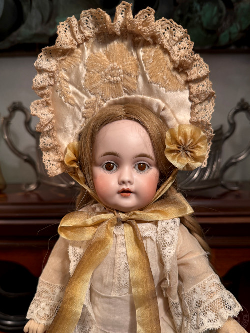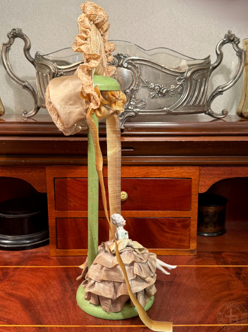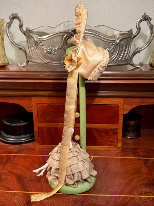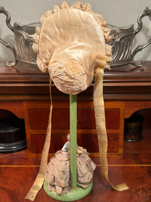 古い素材を使った手作りボンネット アンティークシルク地 お顔周り 14cm 光沢のあるアンティークのシルク地をベースに古い素材で装飾したドール用ボンネット。 シルク地にはモールでお花の刺繍が入っていて素敵です。 結び紐も古いシルクリボンを使っています。 結び方である程度のサイズに対応できますが、30〜40cm位の子向けのサイズです。 |