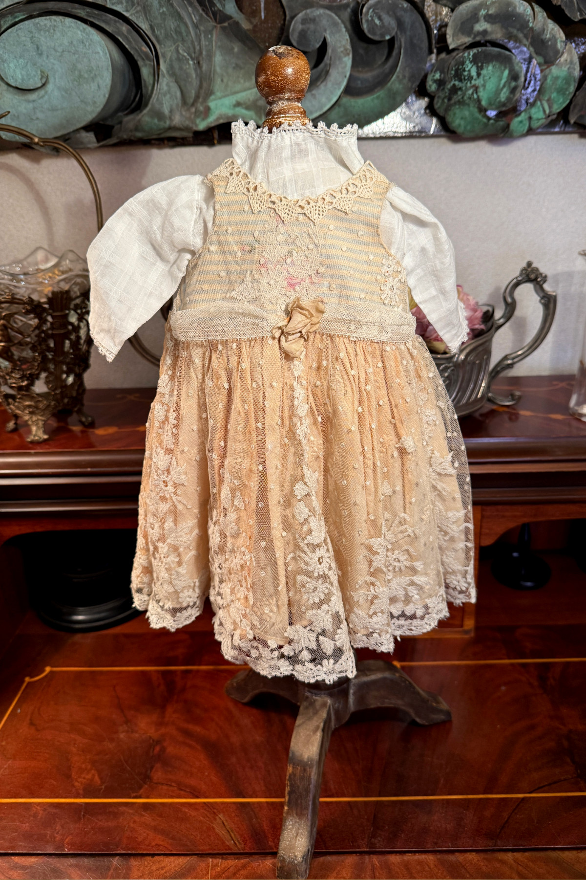 古い素材で作られたドールドレス&ボンネット クリーム色 着丈31cm
