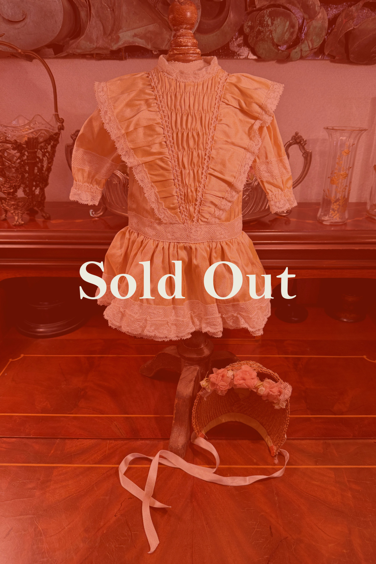 古い素材を使った手作りドールドレス&ボンネット ピンク 着丈20cm 3号サイズ