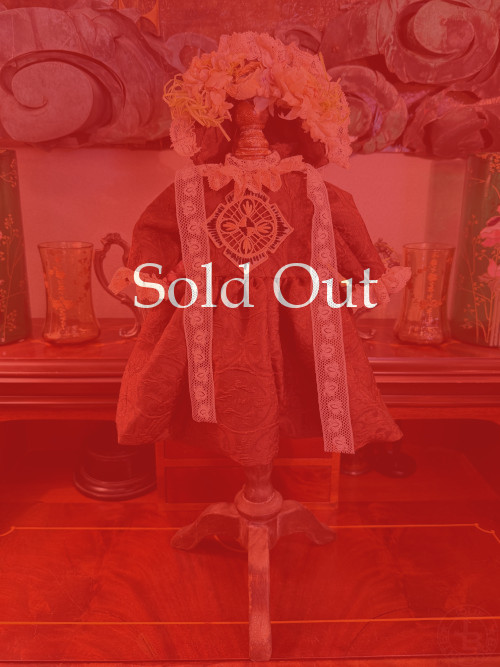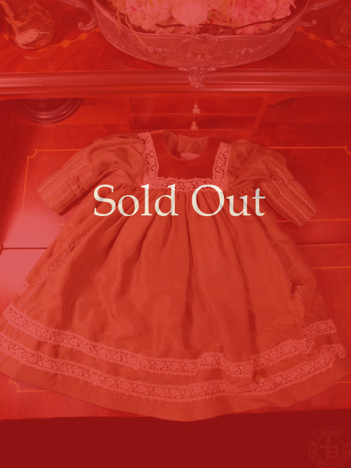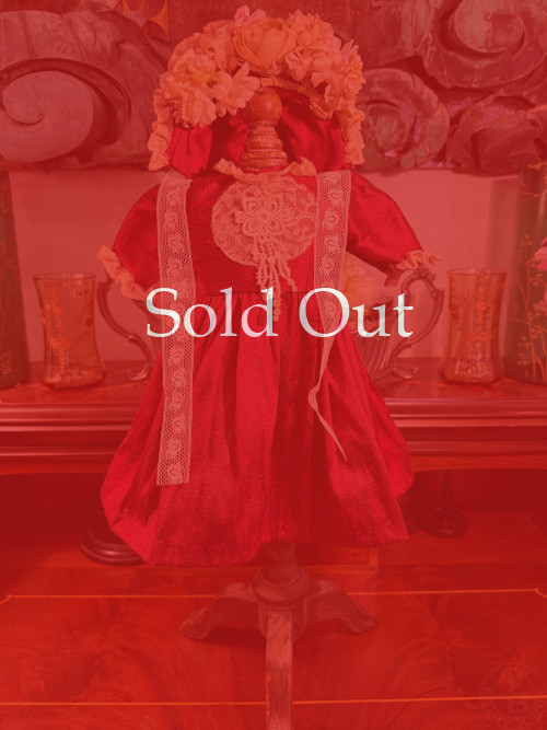 古い素材を使った手作りドールドレス&ボンネット シルク 赤 着丈28cm