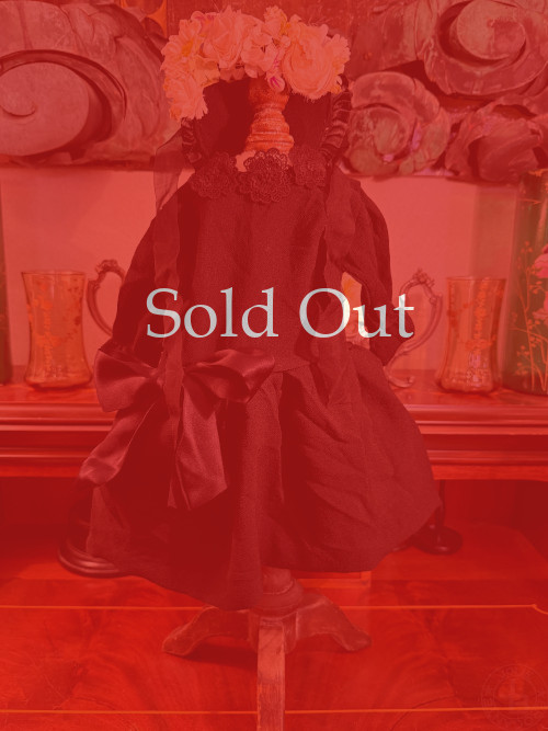 古いレースを使った手作りドールドレス&ボネ ブラック シルク地 着丈30cm