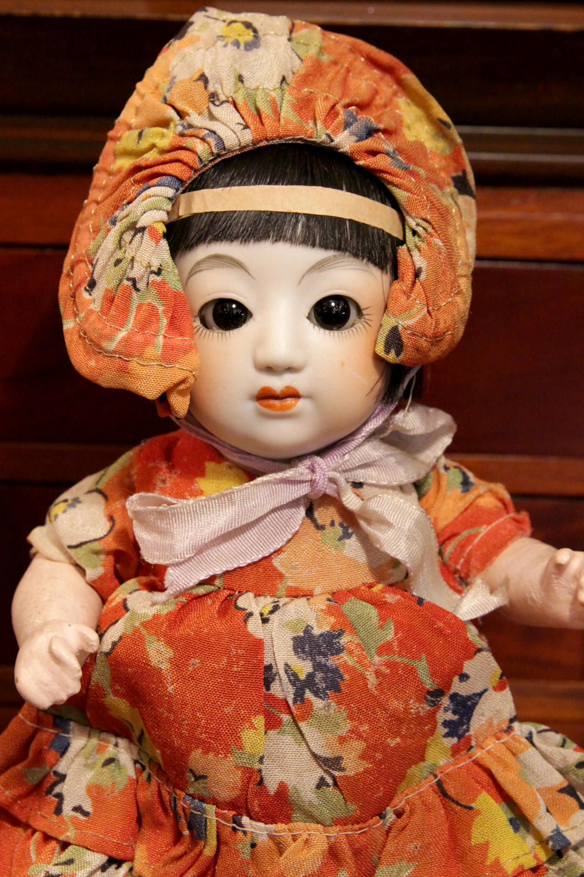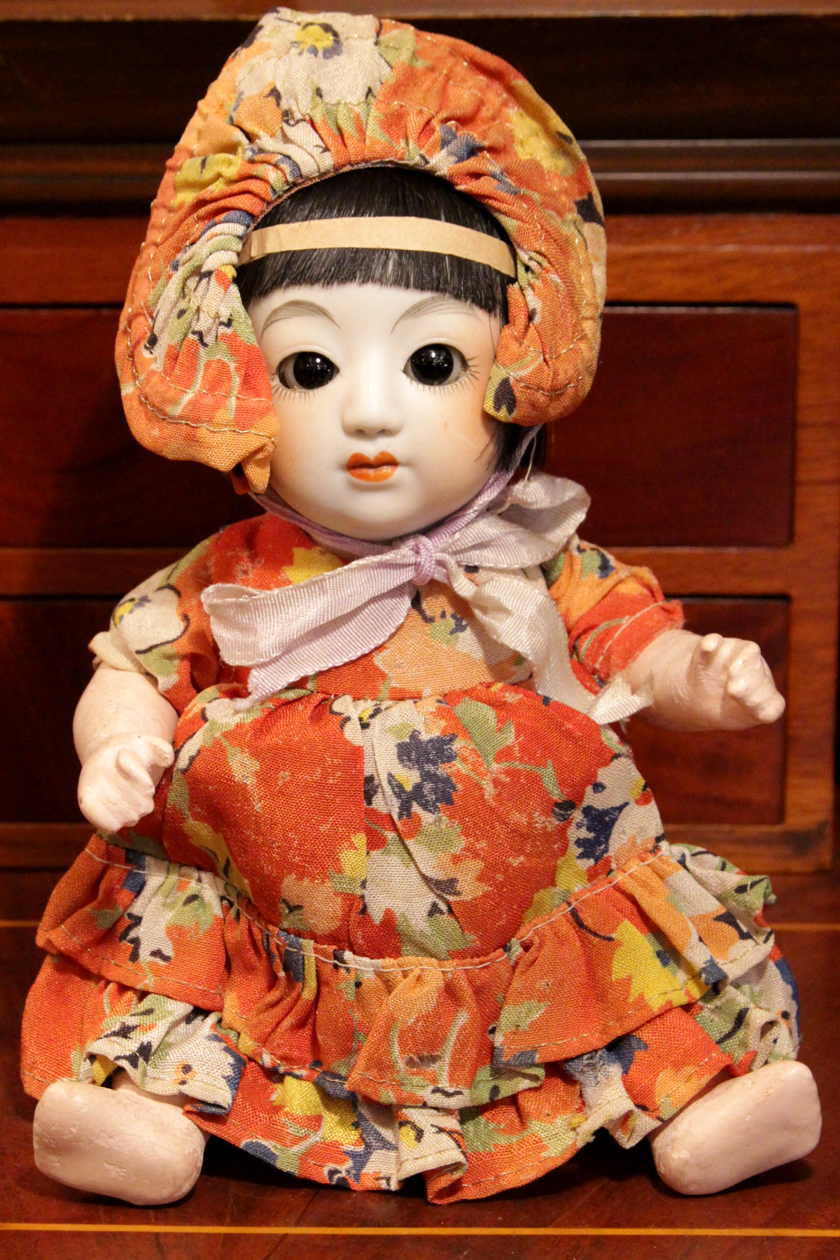 ドレスとボンネットは共布で花柄プリントが入ったオリジナルの物です。