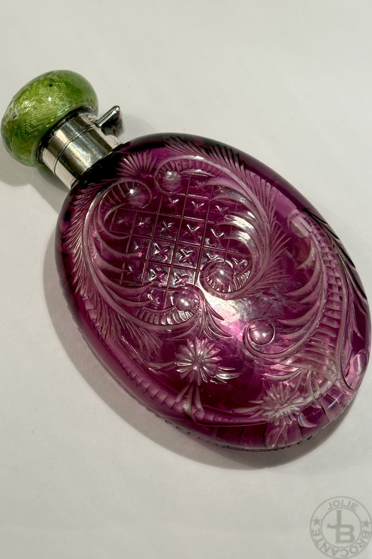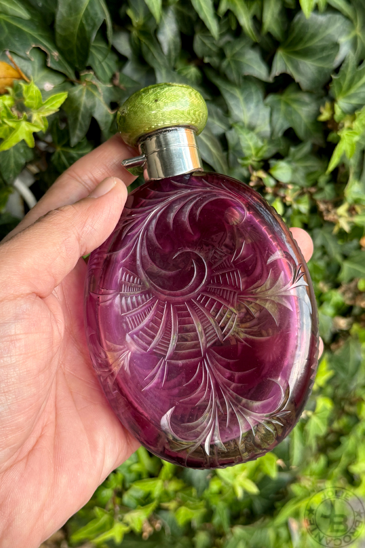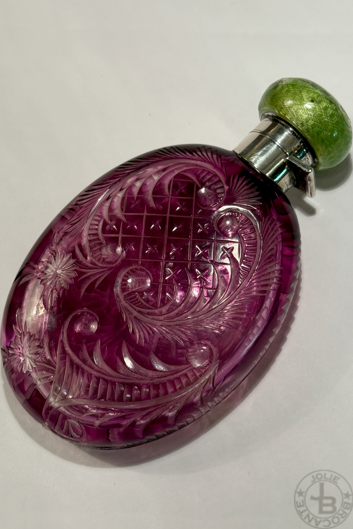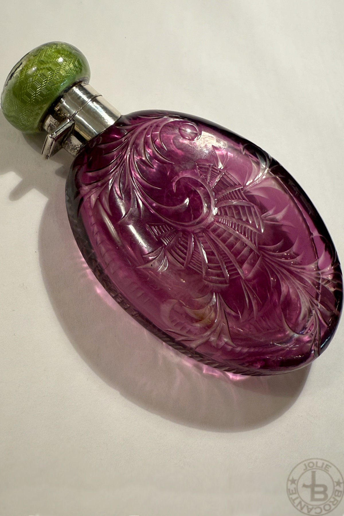 アメシストガラスにハンドカットで模様が彫り込まれた香水瓶。
