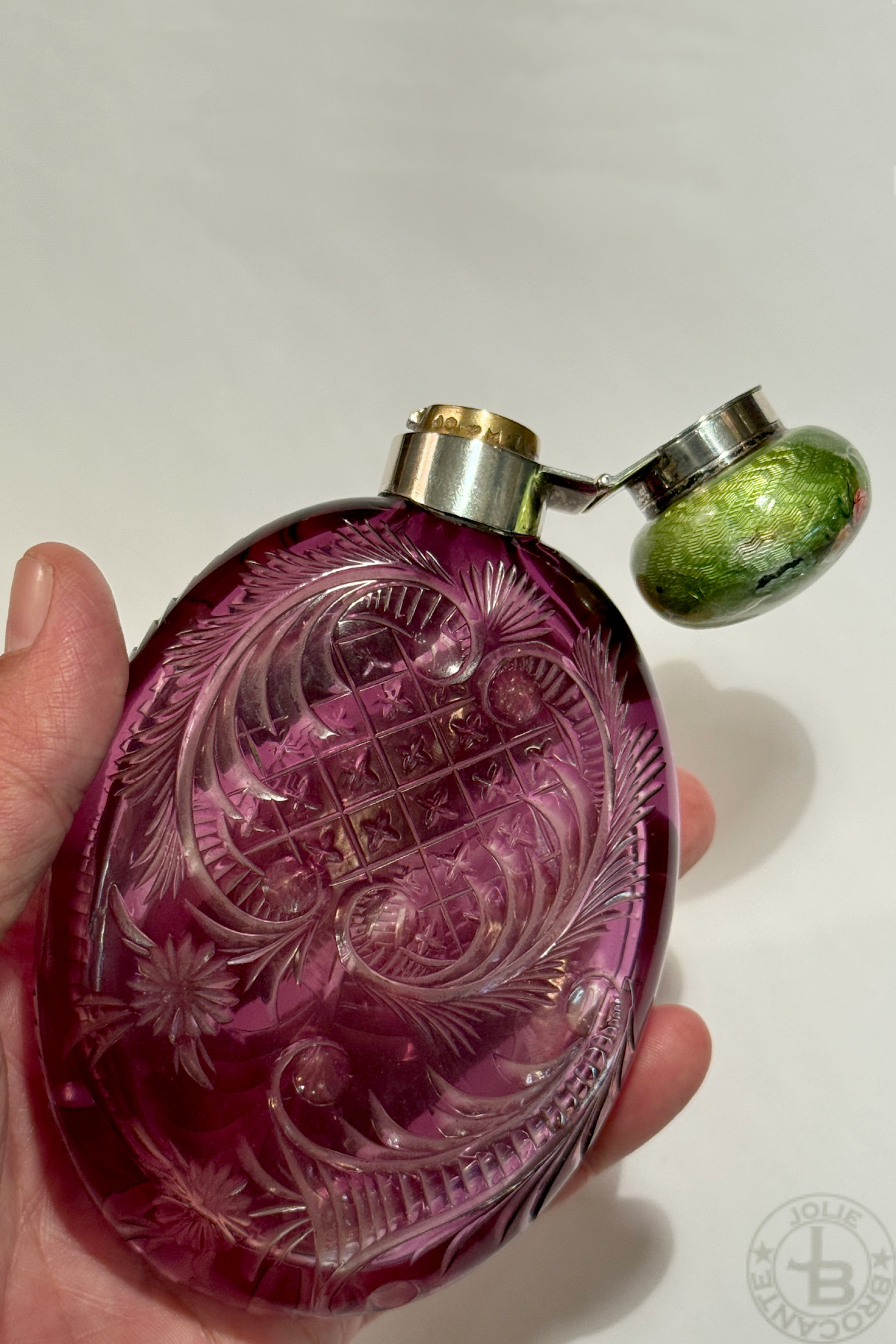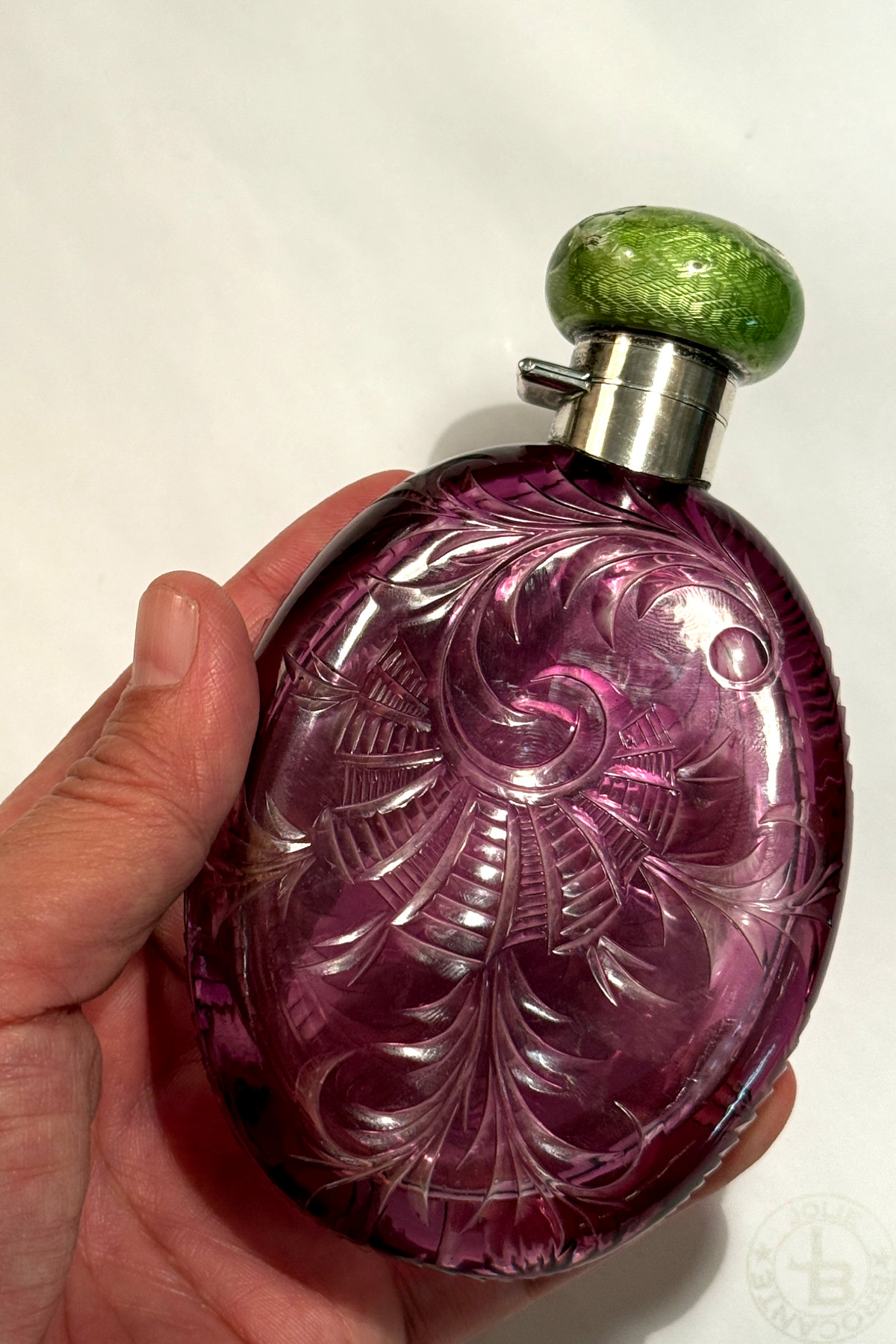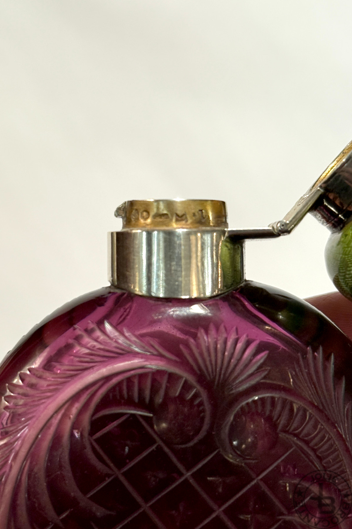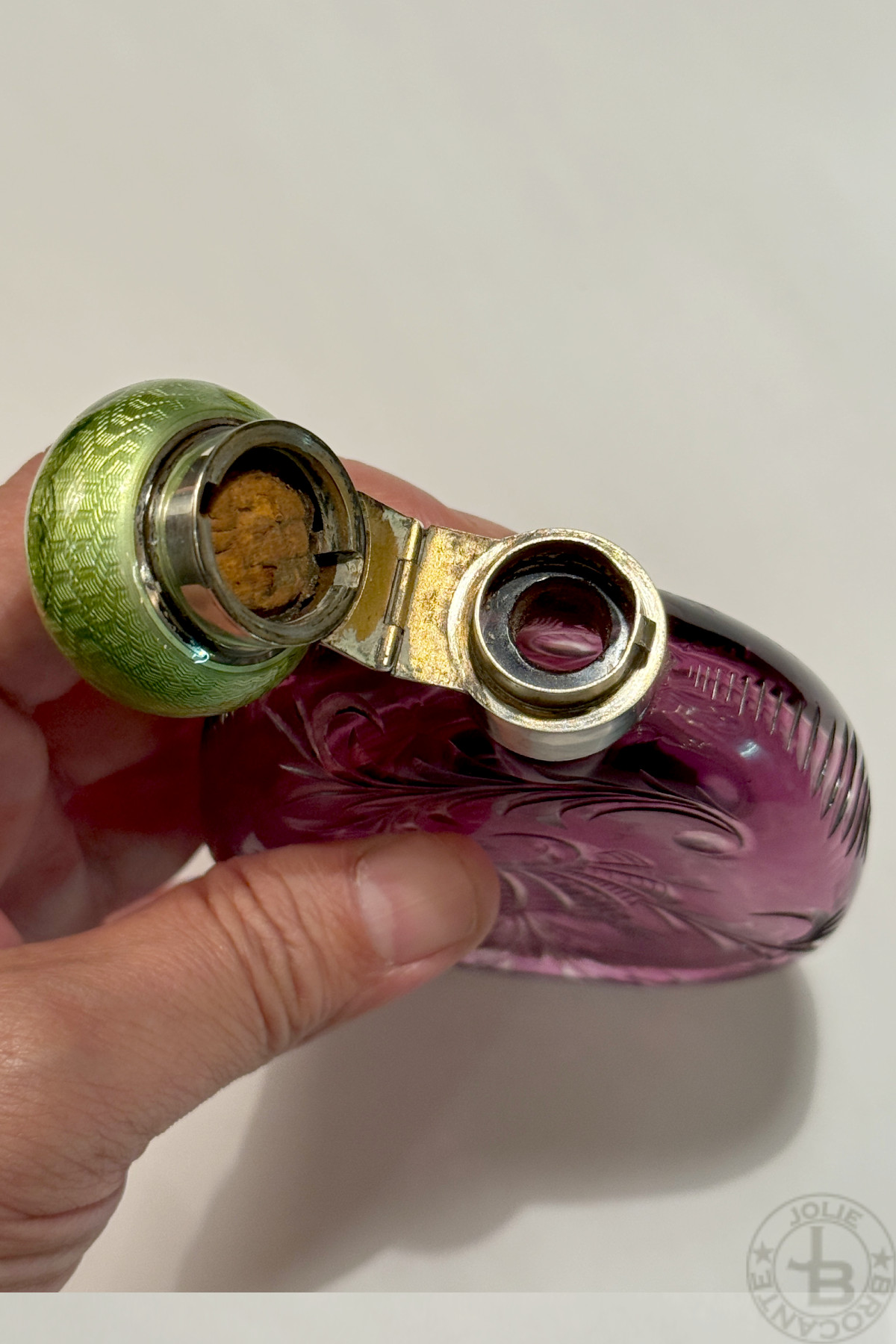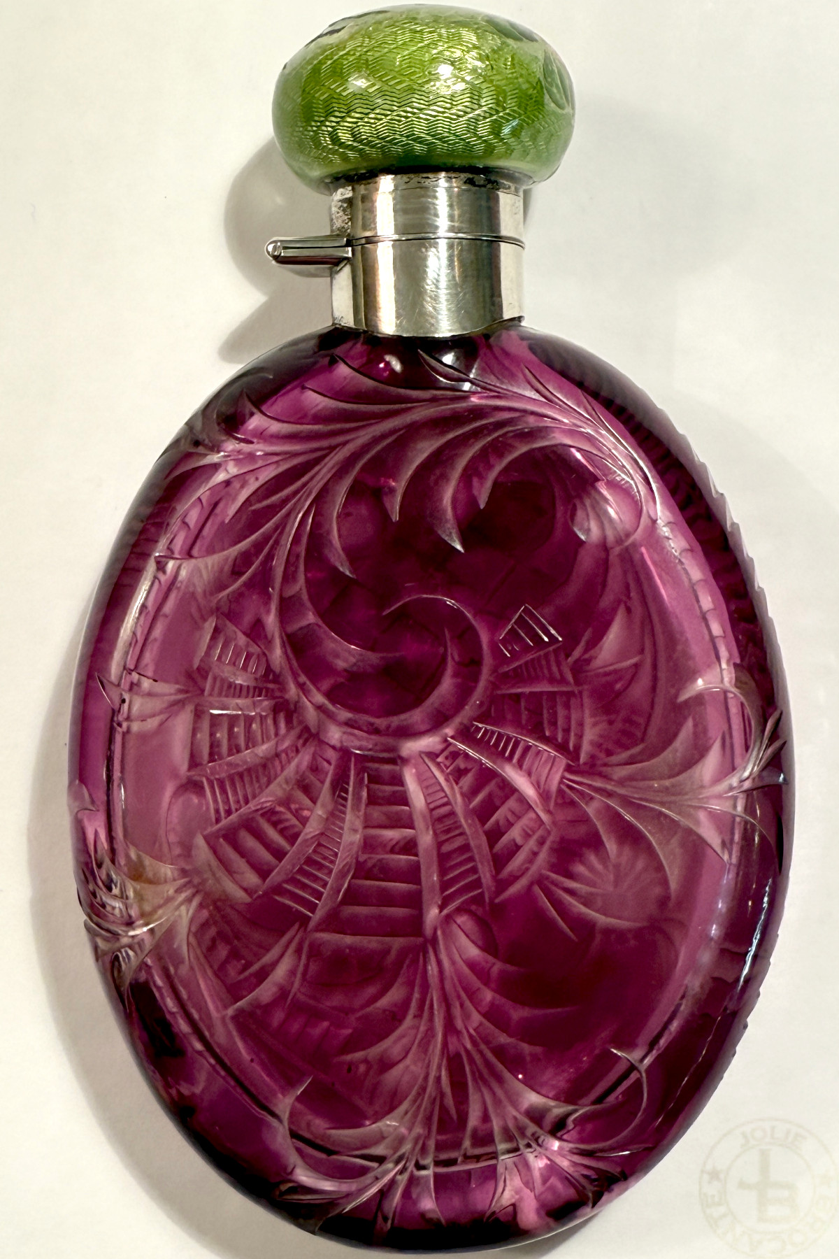 アメシストガラスにハンドカットで模様が彫り込まれた香水瓶。