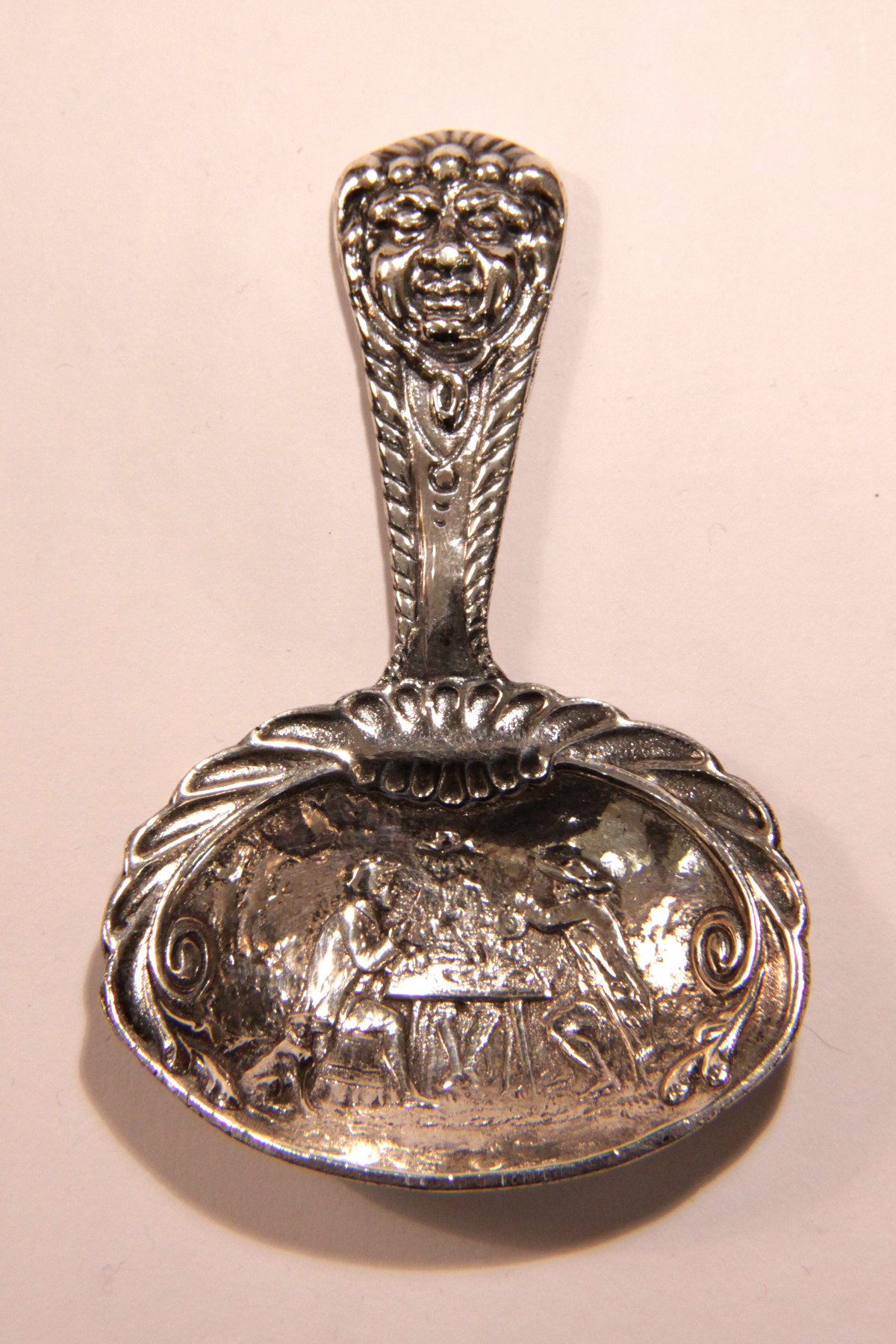 柄の先にはマスクのモティーフとボウル部分には3人の男性が屋外で