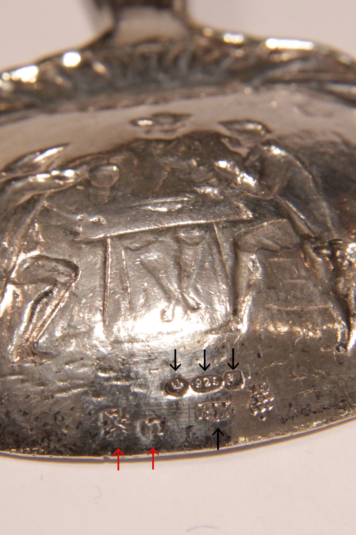 下の黒い矢印はメーカーマーク、赤い矢印はドイツハーナウの銀製品に使われた刻印