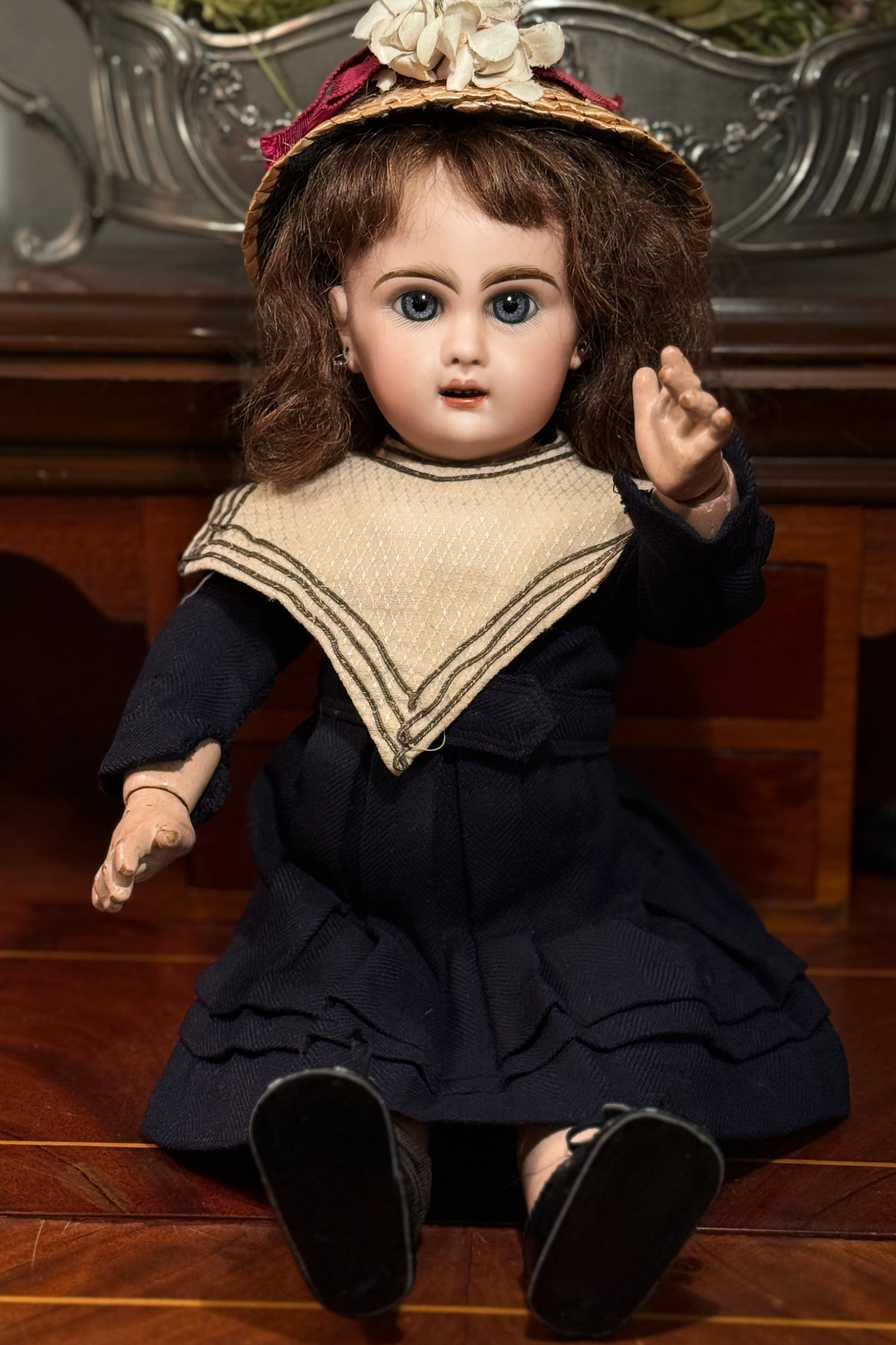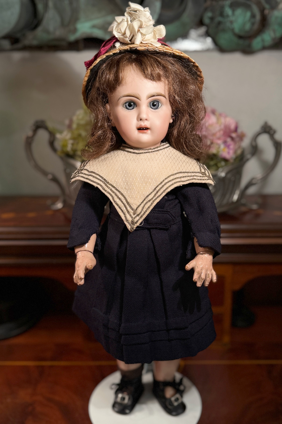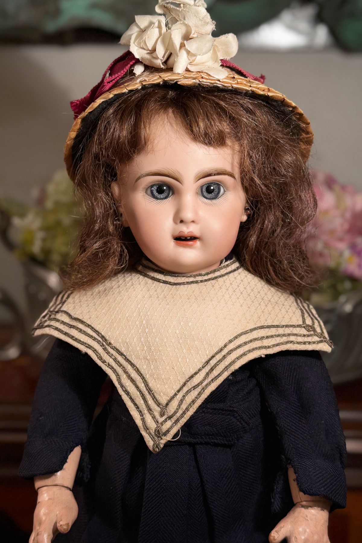 お帽子は現代の麦わらをベースに古いリボン等で装飾してあります。