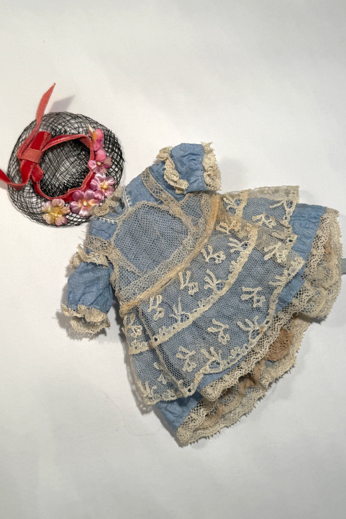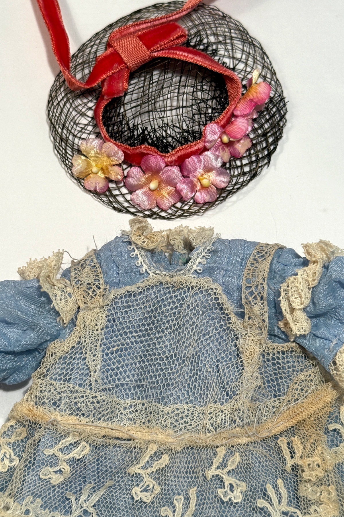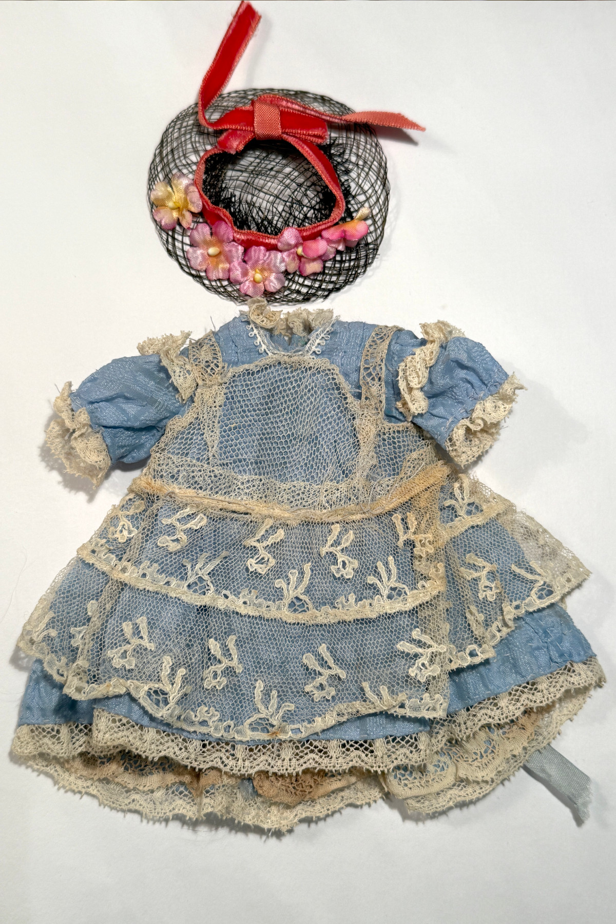 い素材を使った手作りドールドレス&帽子 水色 着丈12.5cm 小さなサイズ チェック模様の入った水色の生地に古いレースなどで装飾されたドールドレス。 黒いメッシュのお帽子とセットになっています。 レース使いのかわいいドレスです。前と後ろで丈の長さが変えてある作りです。 ジュモーの1号(25cm)より小さい子にも向いています。 首回りがタイトに作られていて1号に着せる場合一番上のボタンをかけるのが大変です。 背中開きで貝ボタンが3つついています。 かわいらしいサイズのかわいらしいドレスです。 |