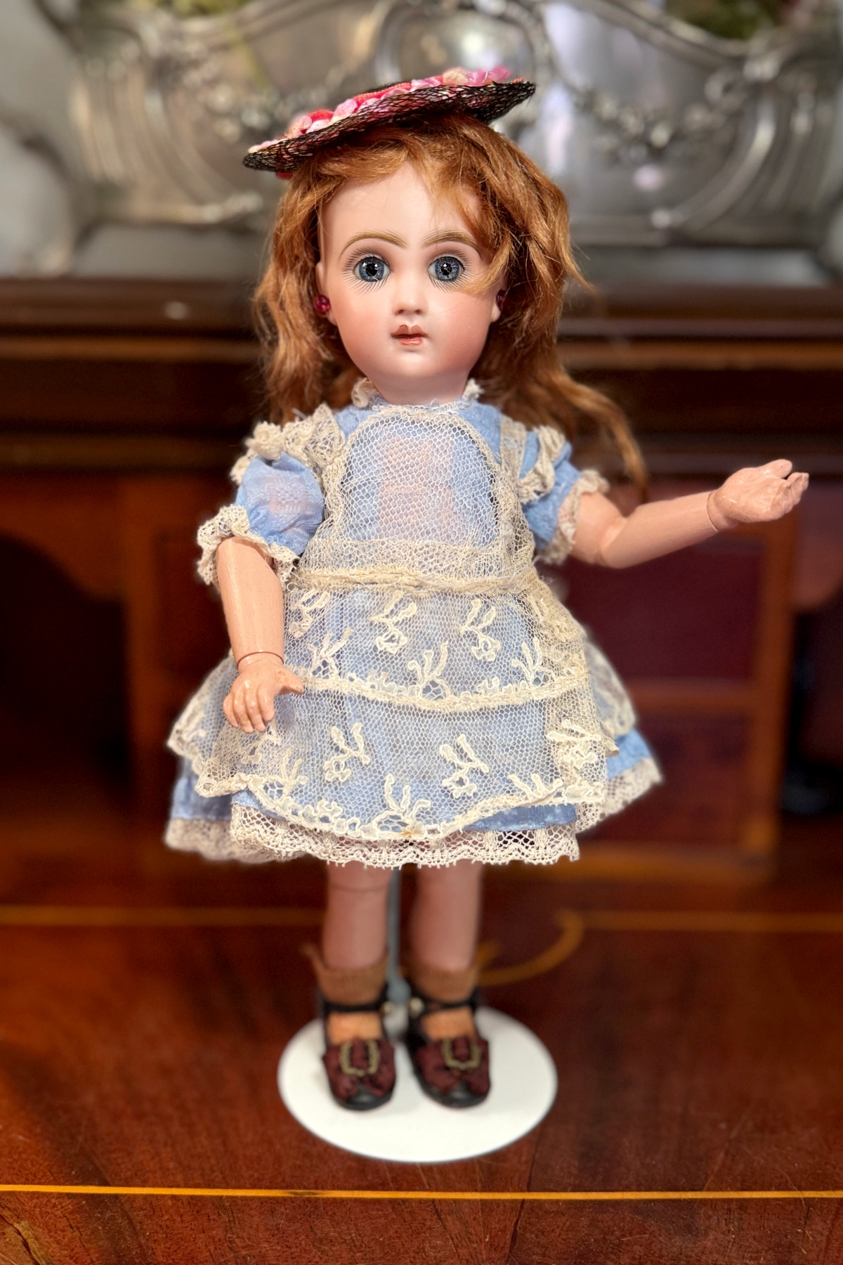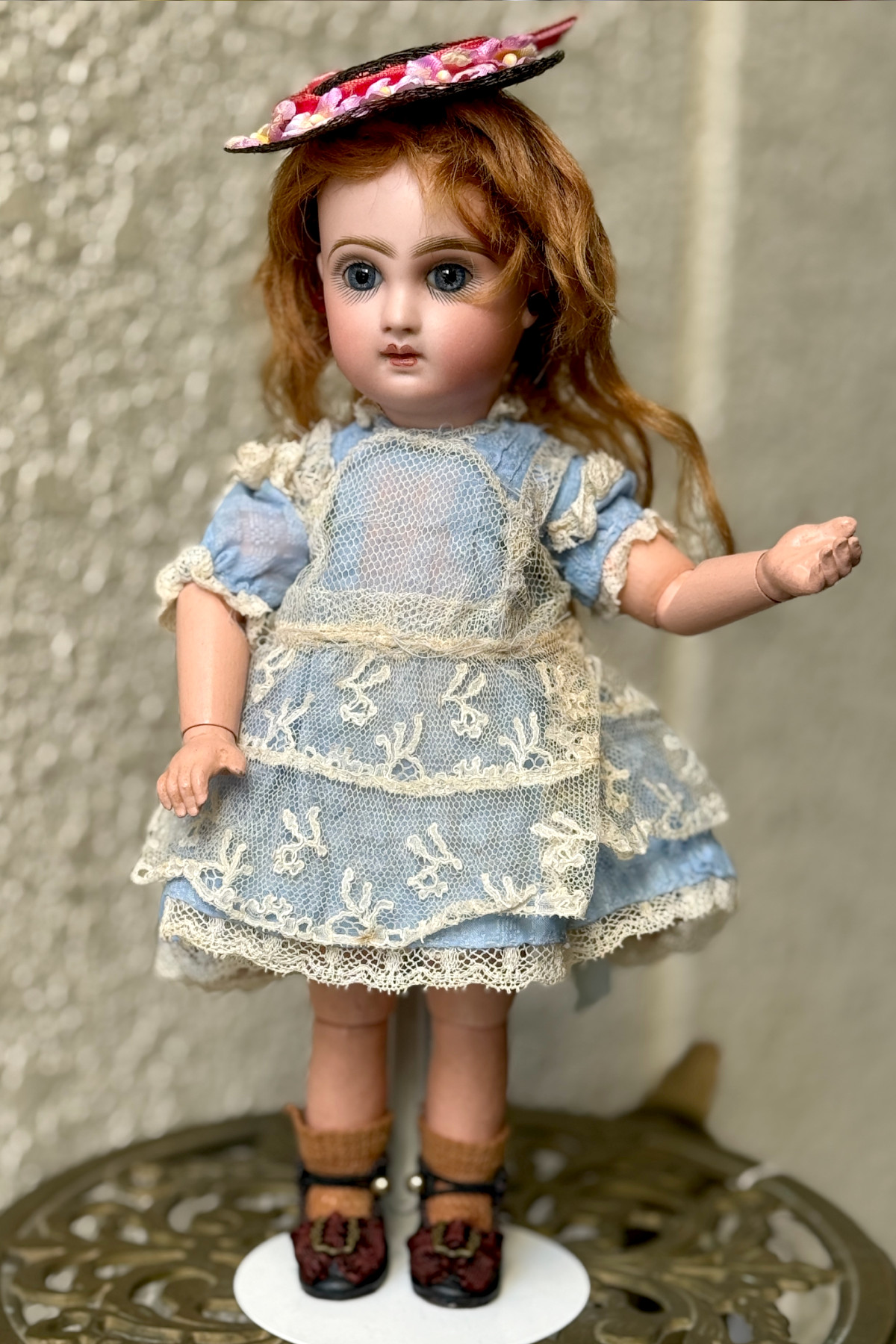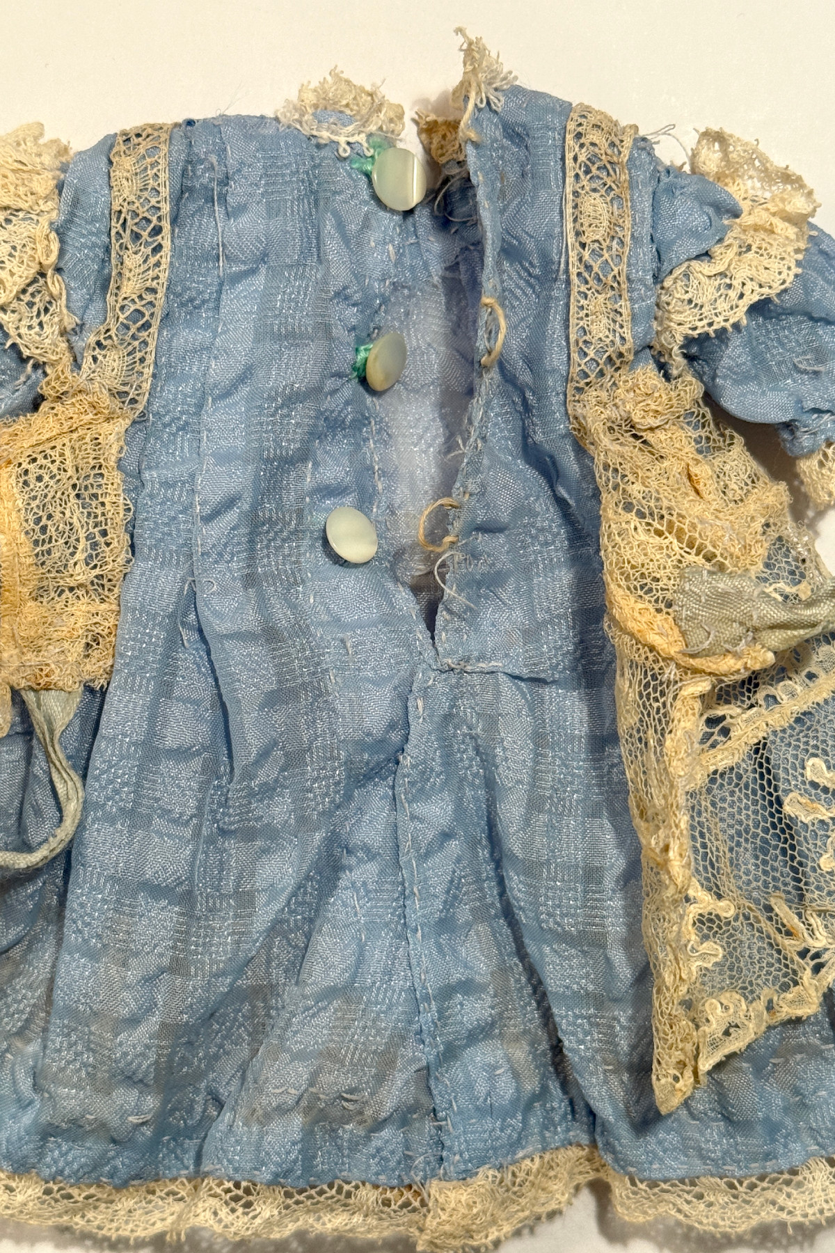 い素材を使った手作りドールドレス&帽子 水色 着丈12.5cm 小さなサイズ チェック模様の入った水色の生地に古いレースなどで装飾されたドールドレス。 黒いメッシュのお帽子とセットになっています。 レース使いのかわいいドレスです。前と後ろで丈の長さが変えてある作りです。 ジュモーの1号(25cm)より小さい子にも向いています。 首回りがタイトに作られていて1号に着せる場合一番上のボタンをかけるのが大変です。 背中開きで貝ボタンが3つついています。 かわいらしいサイズのかわいらしいドレスです。 |