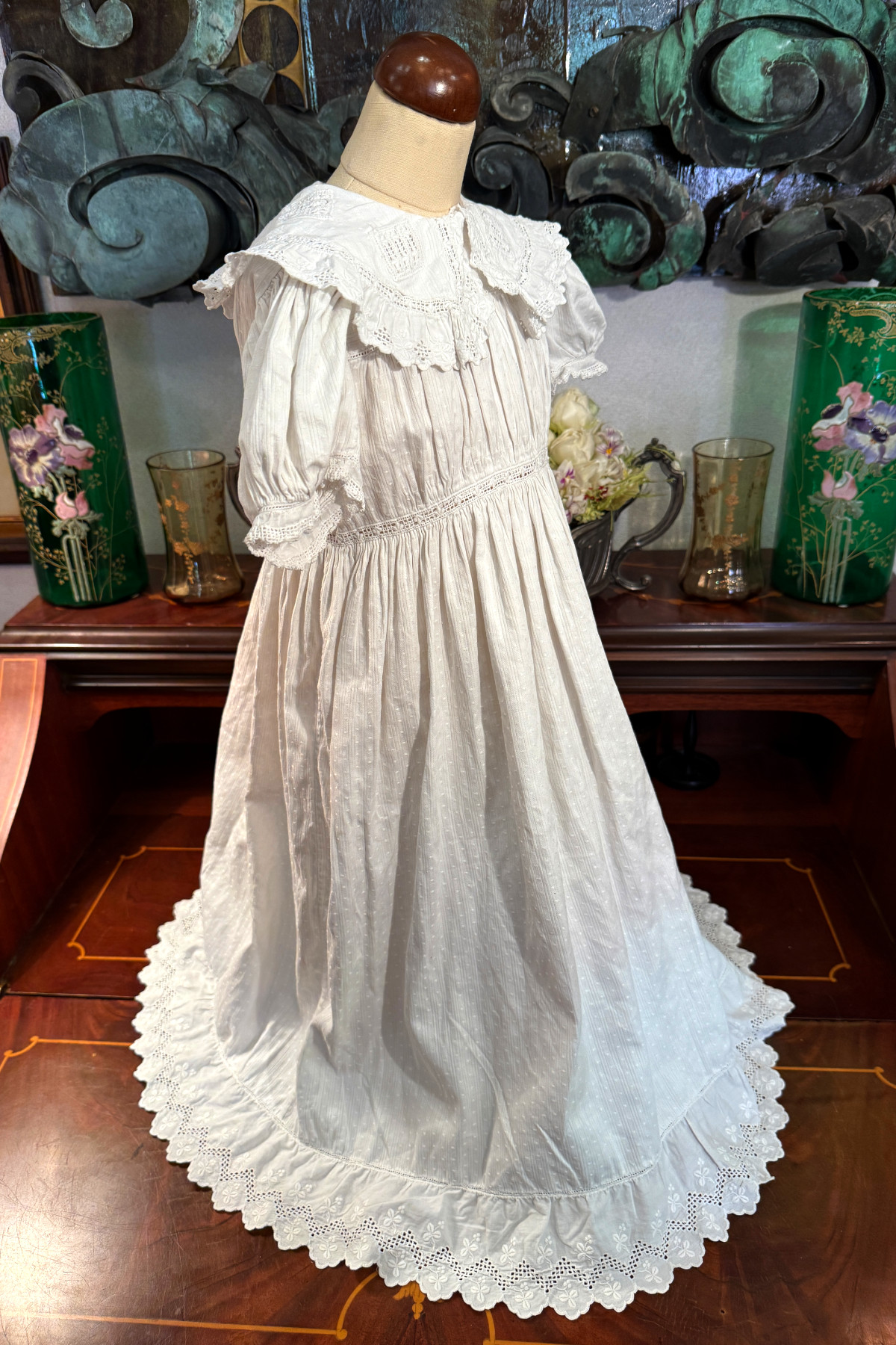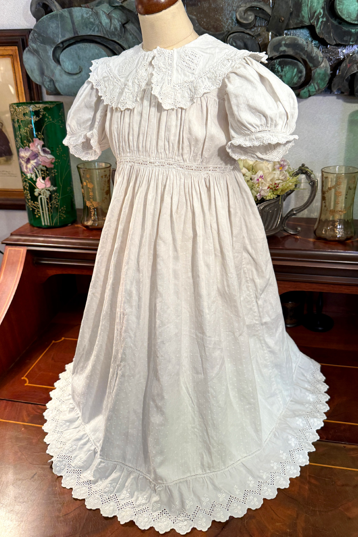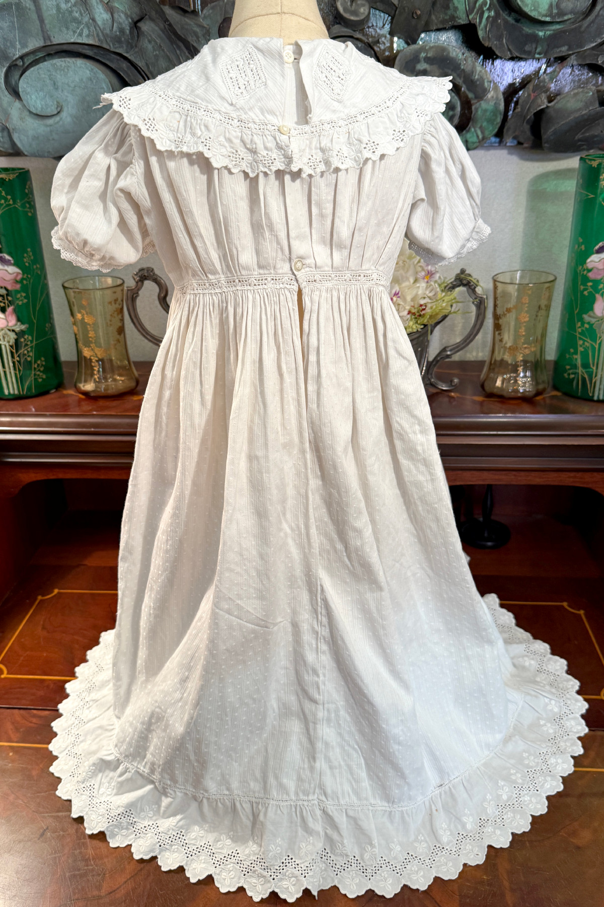 古 いベビードレス ホワイトワーク クローバー 着丈63cm