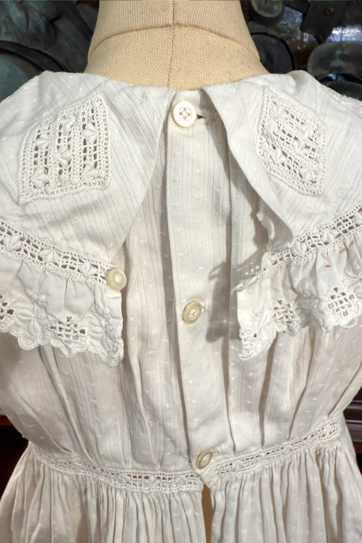 背中開きで背中に3つと襟に1つ貝ボタンがついています。