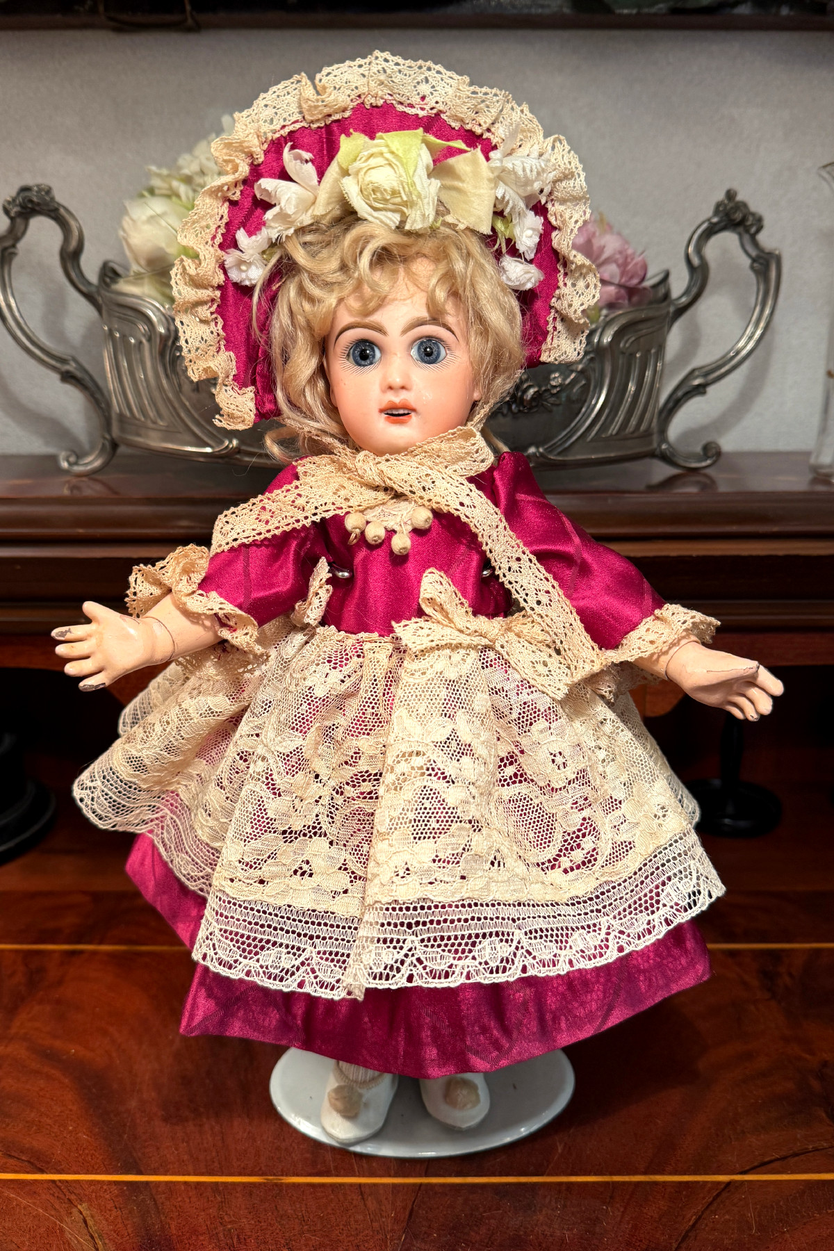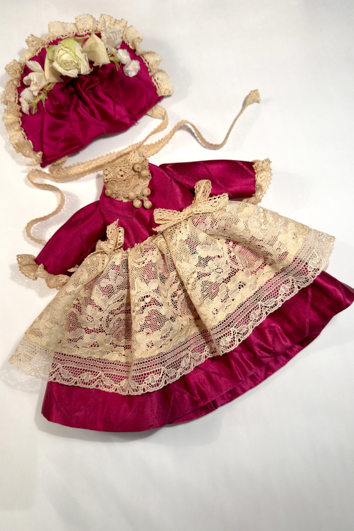 い素材を使った手作りドールドレス&ボンネット ピンク 着丈20cm 3号サイズ 赤に近いピンクで光沢のある古いシルク生地に古いレースなどで装飾されたドールドレス。 共布で出来たボンネットとセットになっています。 シルク地は直線的な地模様が入っています。 襟、胸元、袖とスカート部分には古いレースをあしらってあります。 ウェスト周りは袖と同じレースでリボン飾りをつけてありかわいいです。 胸元には球状の飾りが下がっていてかわいいです。 背中開きでスナップボタンが3つついています。 大きく開く作りでお着替えもしやすくなっています。 ボンネットは古いレースと作家物の布花で装飾してあります。 かわいらしいサイズのかわいらしいドレスです。 |