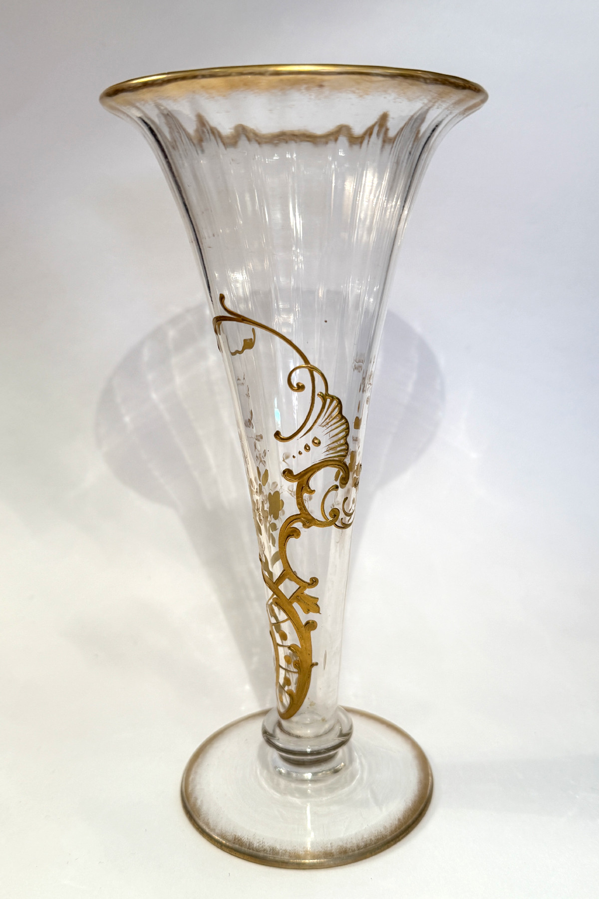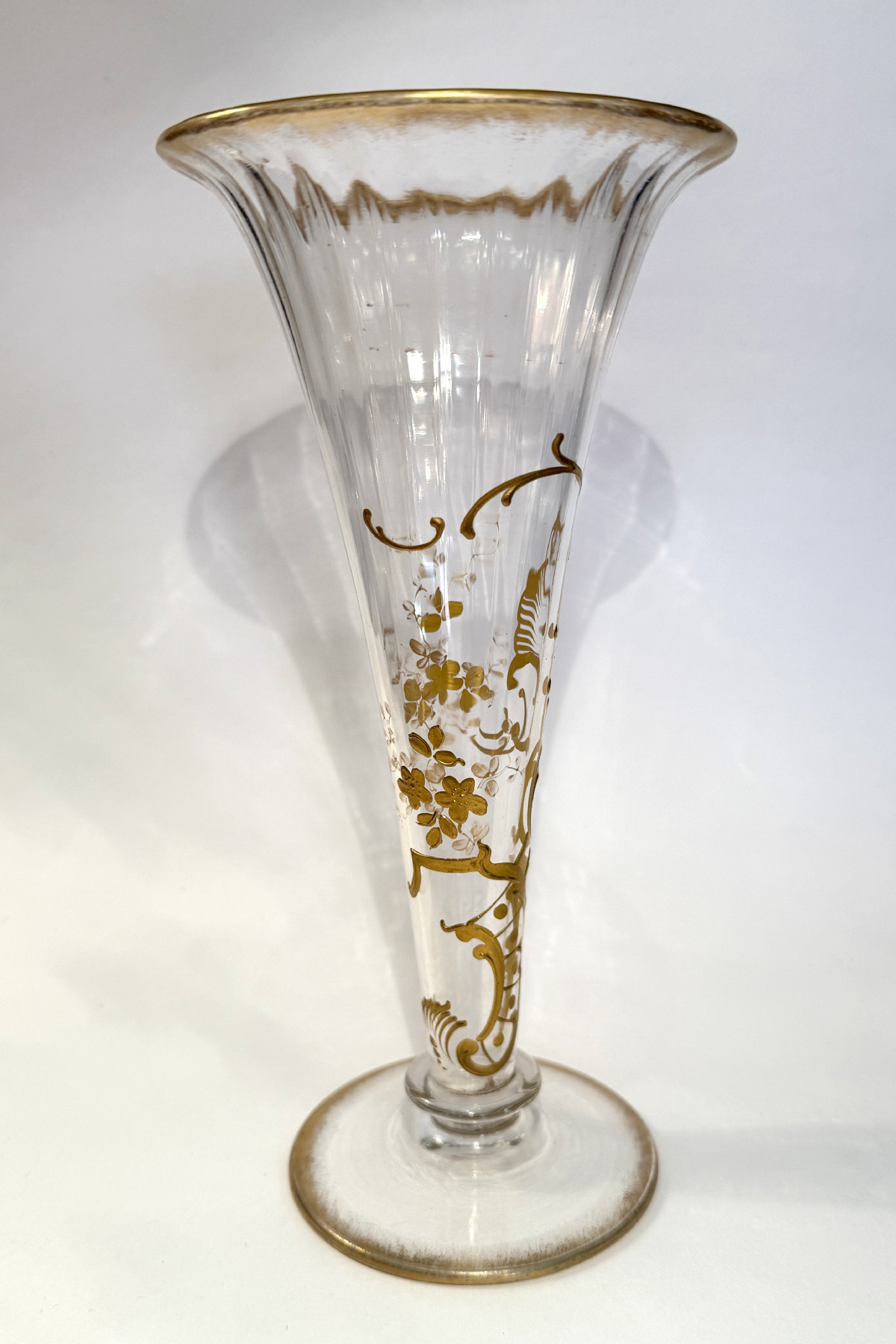 ラッパ型のやや小ぶりな花瓶。金彩でロカイユ紋様と花柄が絵付けされた美しい花瓶です。
