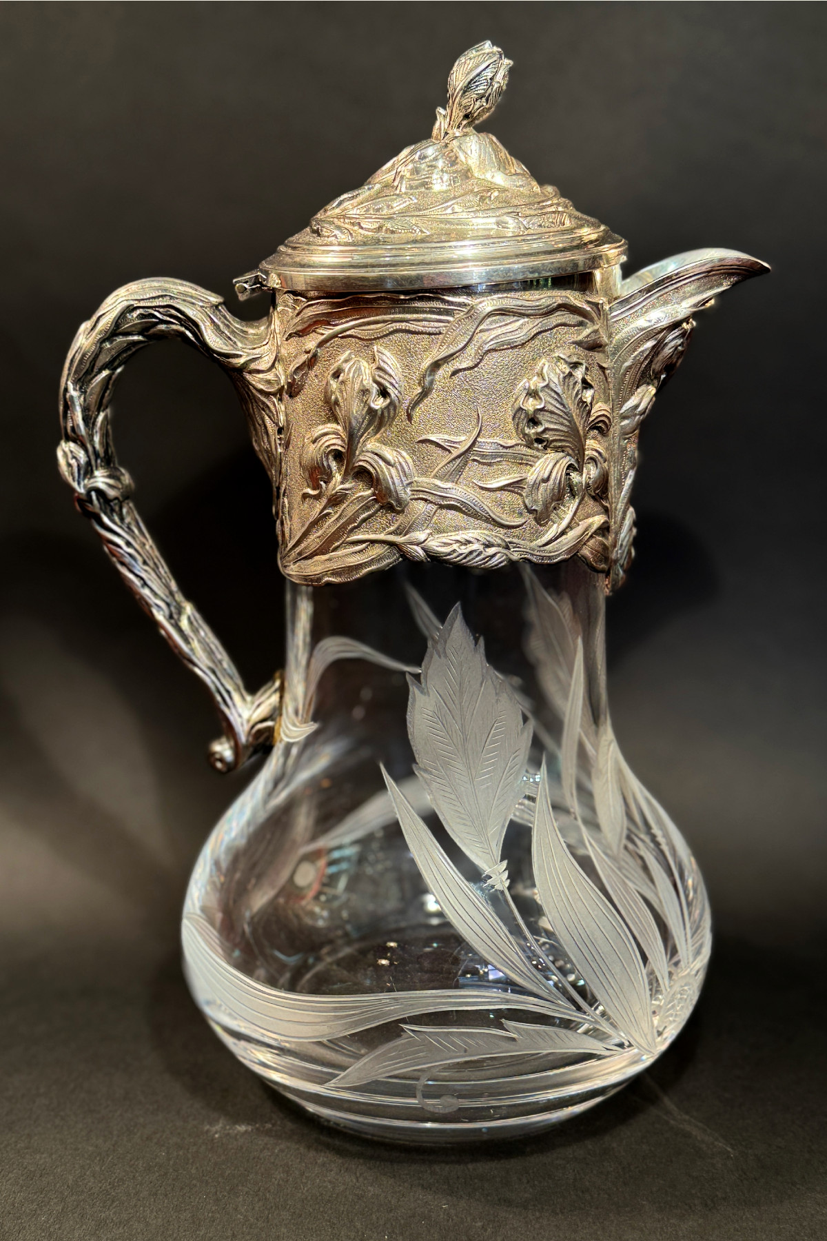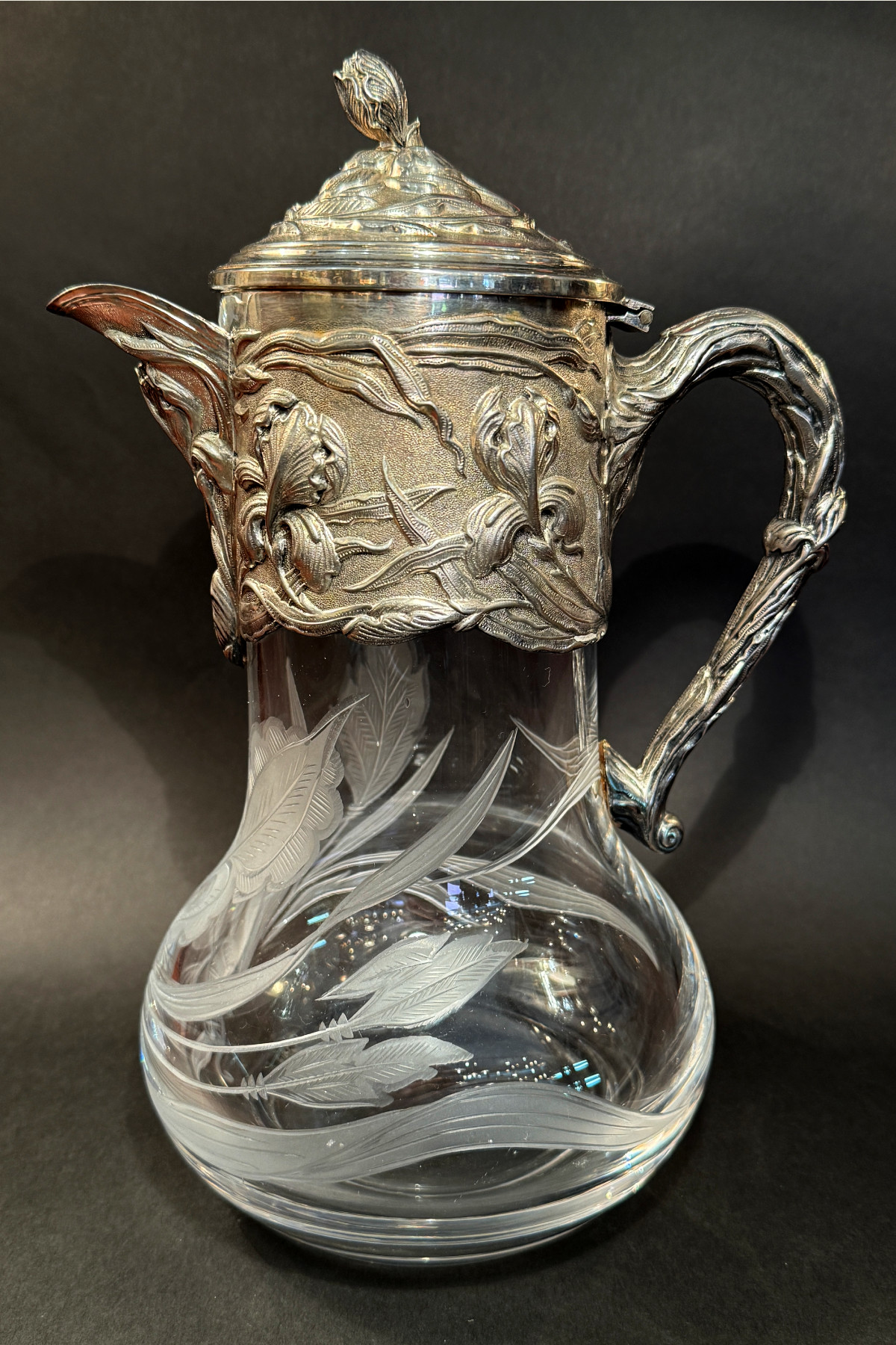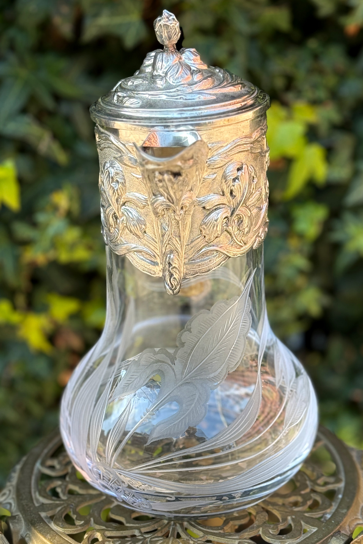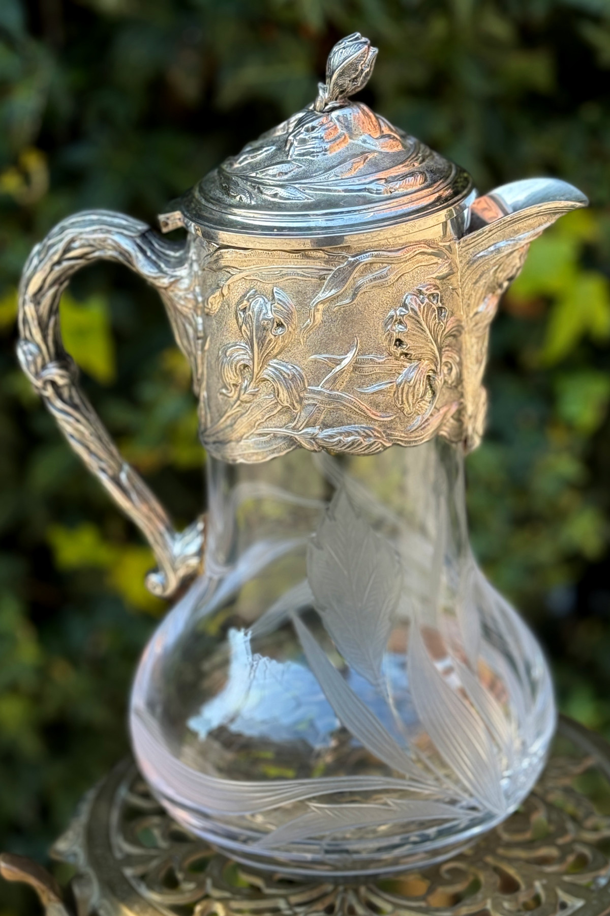 pitcher フランスの銀器メーカーVictor Saglier(ヴィクトル・サグリエ)作のアールヌーボーのピッチャー(水差し)。 ヴィクトル・サグリエはアールヌーボーの作品が有名でマジョレル、 ドーム、ガレに様々な作品を提供しました。 こちらのピッチャーはサグリエのサインは入っていませんが、 金属部分がほぼ同じデザイン の作があります。 肉厚な作りでアイリスがいきいきと描かれています。 ハンドル部分にはガマの穂のデザインも見られアールヌーボーらしいデザインです。 ガラス部分は透明なクリスタルガラスで金属部分と同じく アイリスのデザインが施されています。 モティーフは大胆に描かれていて素敵です。 花や葉はサンドブラストで曇らせ縁取りは一部グラビュール、葉脈や花の筋、 茎などはカットが施されていて凝っており、技量の高さを伺わせます。 またカットは深く刻まれていて光が入るとより美しいです。 ガラスの底部に極微細な擦り傷はありますが、水汚れ等も無く美しい状態を保っています。 金属部分はシルバープレートではがれている部分はありません。 蝶番部分が少し歪んでいますがあまりわかりません。 アイリスのデザインが大胆に入った素敵な水差しです。 |