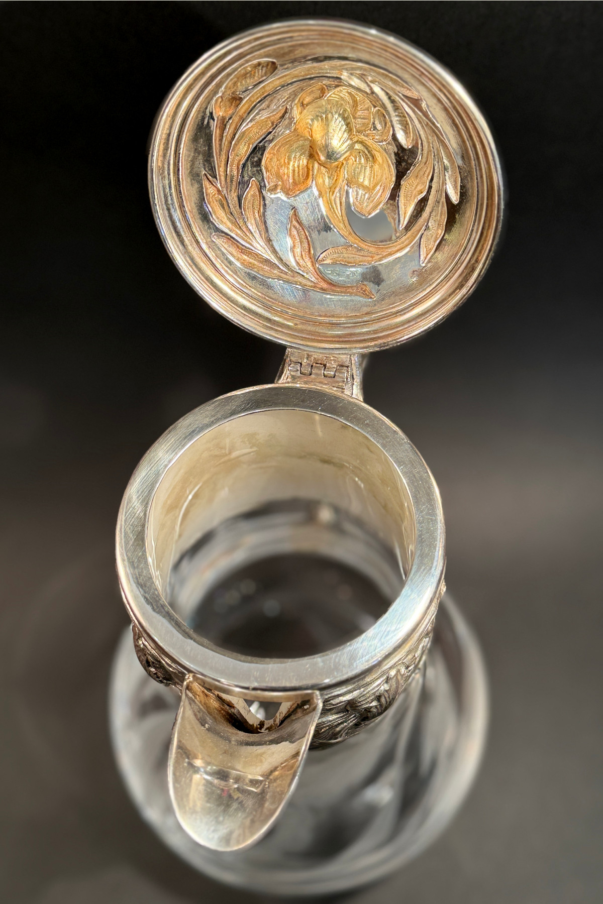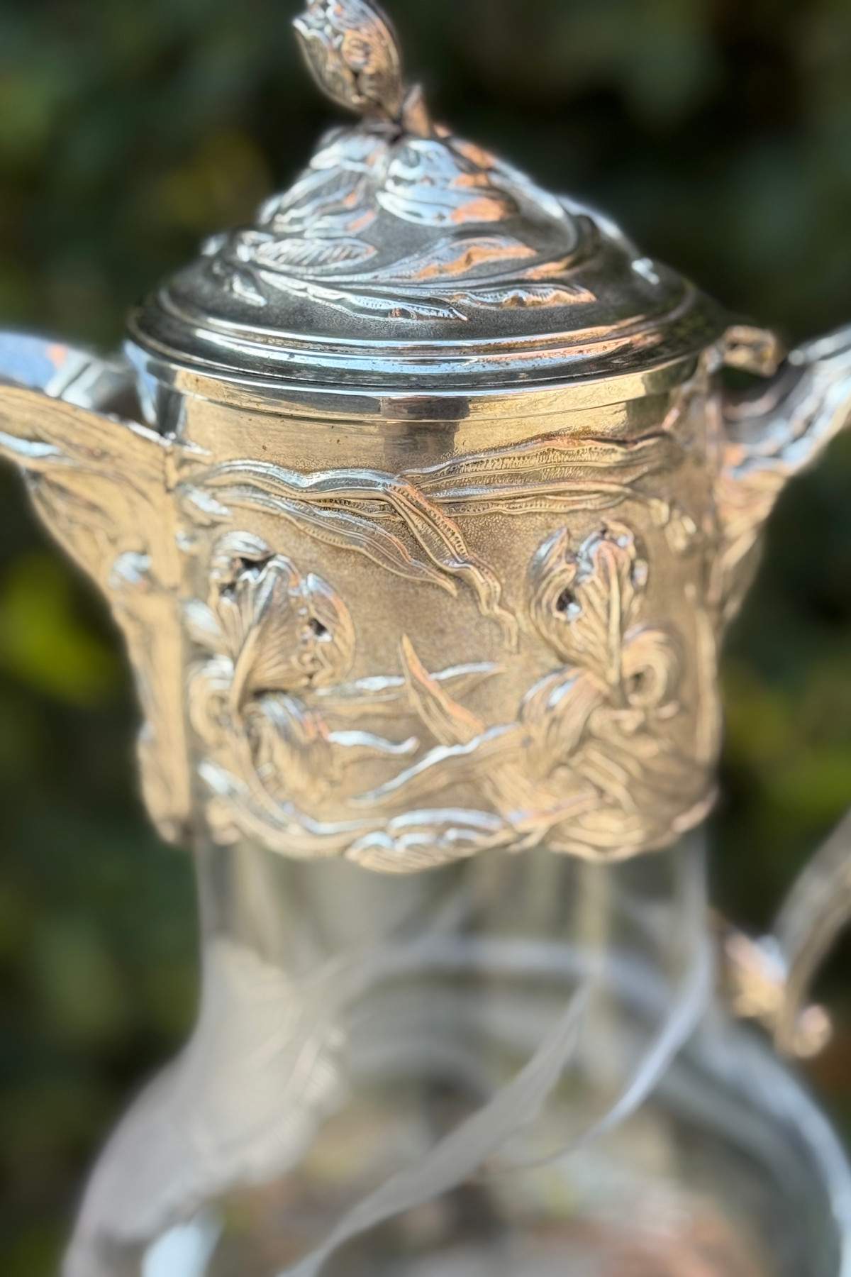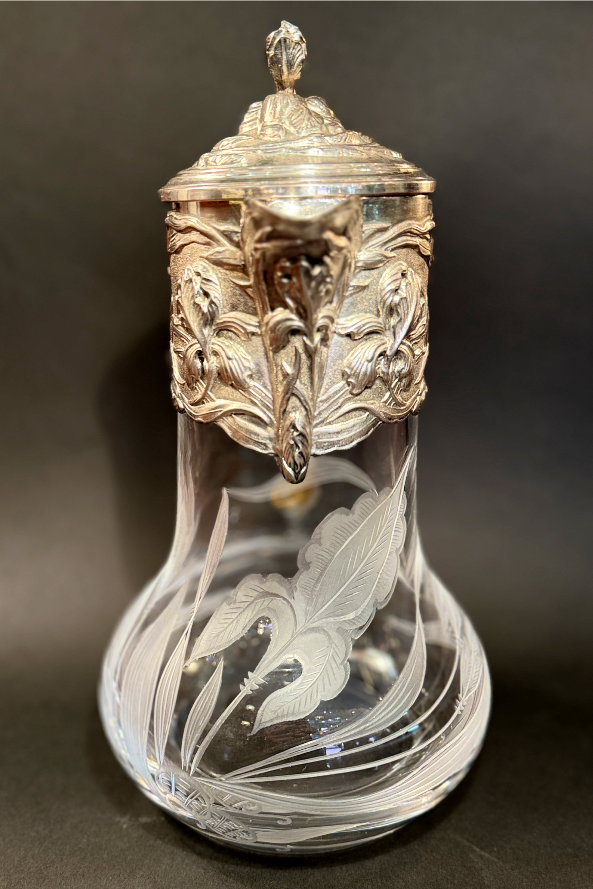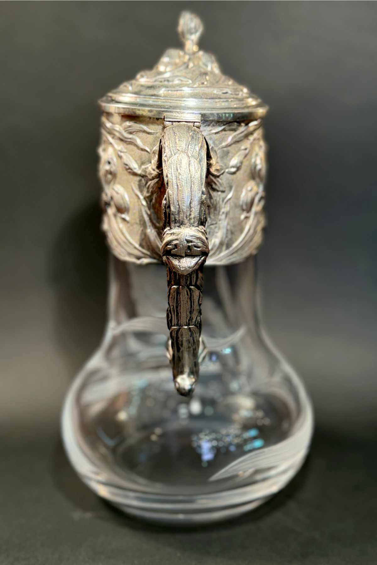 pitcher フランスの銀器メーカーVictor Saglier(ヴィクトル・サグリエ)作のアールヌーボーのピッチャー(水差し)。 ヴィクトル・サグリエはアールヌーボーの作品が有名でマジョレル、 ドーム、ガレに様々な作品を提供しました。 こちらのピッチャーはサグリエのサインは入っていませんが、 金属部分がほぼ同じデザイン の作があります。 肉厚な作りでアイリスがいきいきと描かれています。 ハンドル部分にはガマの穂のデザインも見られアールヌーボーらしいデザインです。 ガラス部分は透明なクリスタルガラスで金属部分と同じく アイリスのデザインが施されています。 モティーフは大胆に描かれていて素敵です。 花や葉はサンドブラストで曇らせ縁取りは一部グラビュール、葉脈や花の筋、 茎などはカットが施されていて凝っており、技量の高さを伺わせます。 またカットは深く刻まれていて光が入るとより美しいです。 ガラスの底部に極微細な擦り傷はありますが、水汚れ等も無く美しい状態を保っています。 金属部分はシルバープレートではがれている部分はありません。 蝶番部分が少し歪んでいますがあまりわかりません。 アイリスのデザインが大胆に入った素敵な水差しです。 |