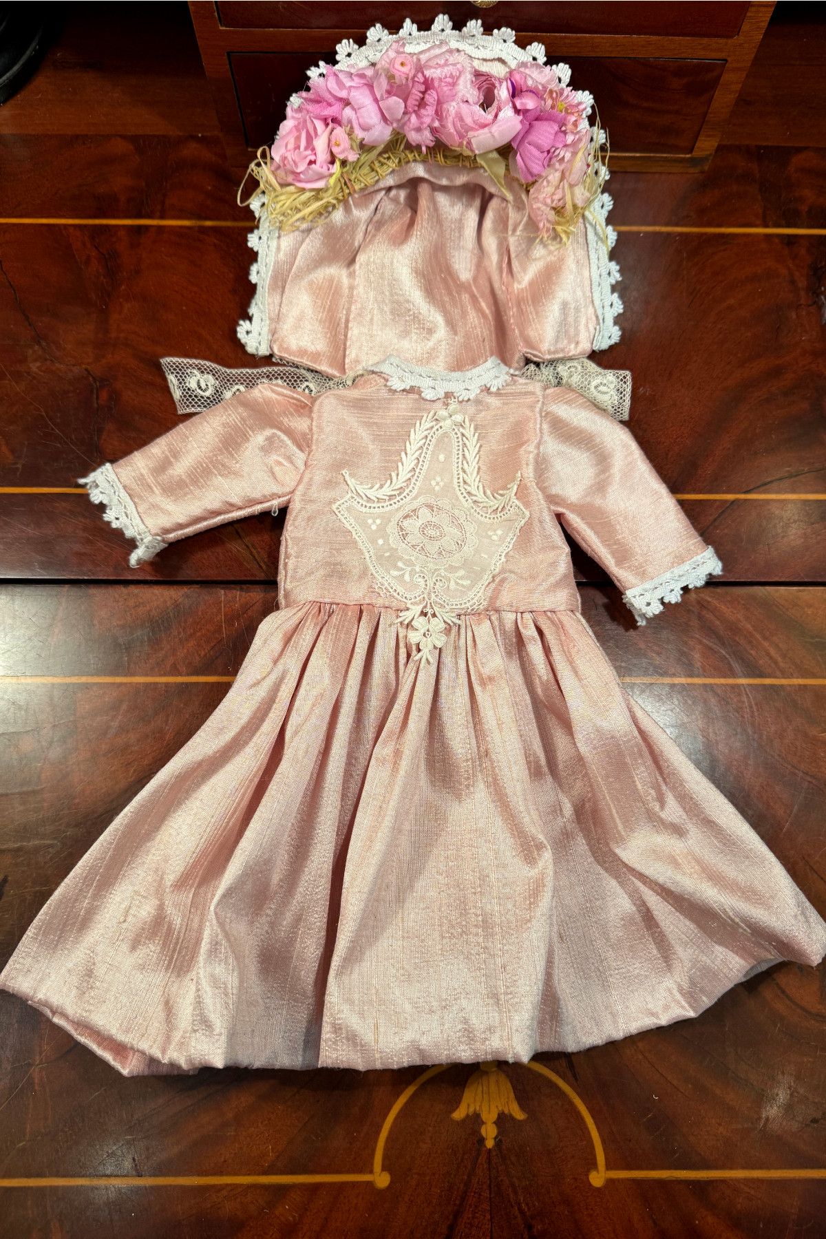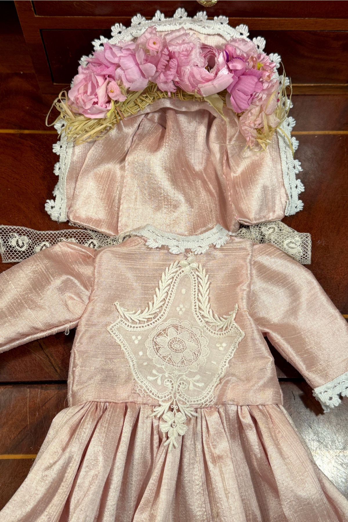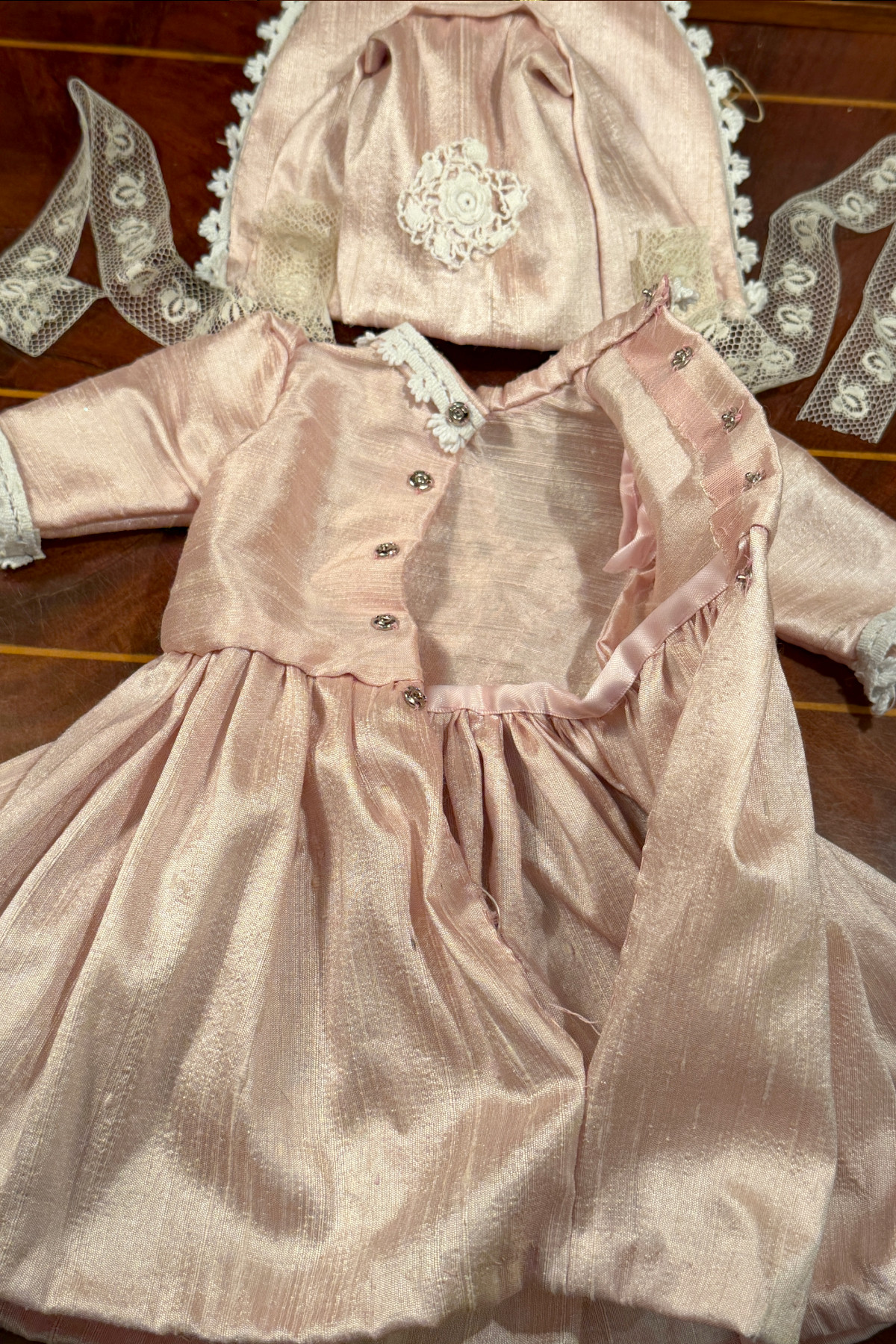 さくら色のシルク生地に古いレースをあしらったドールドレスとボンネットのセット。