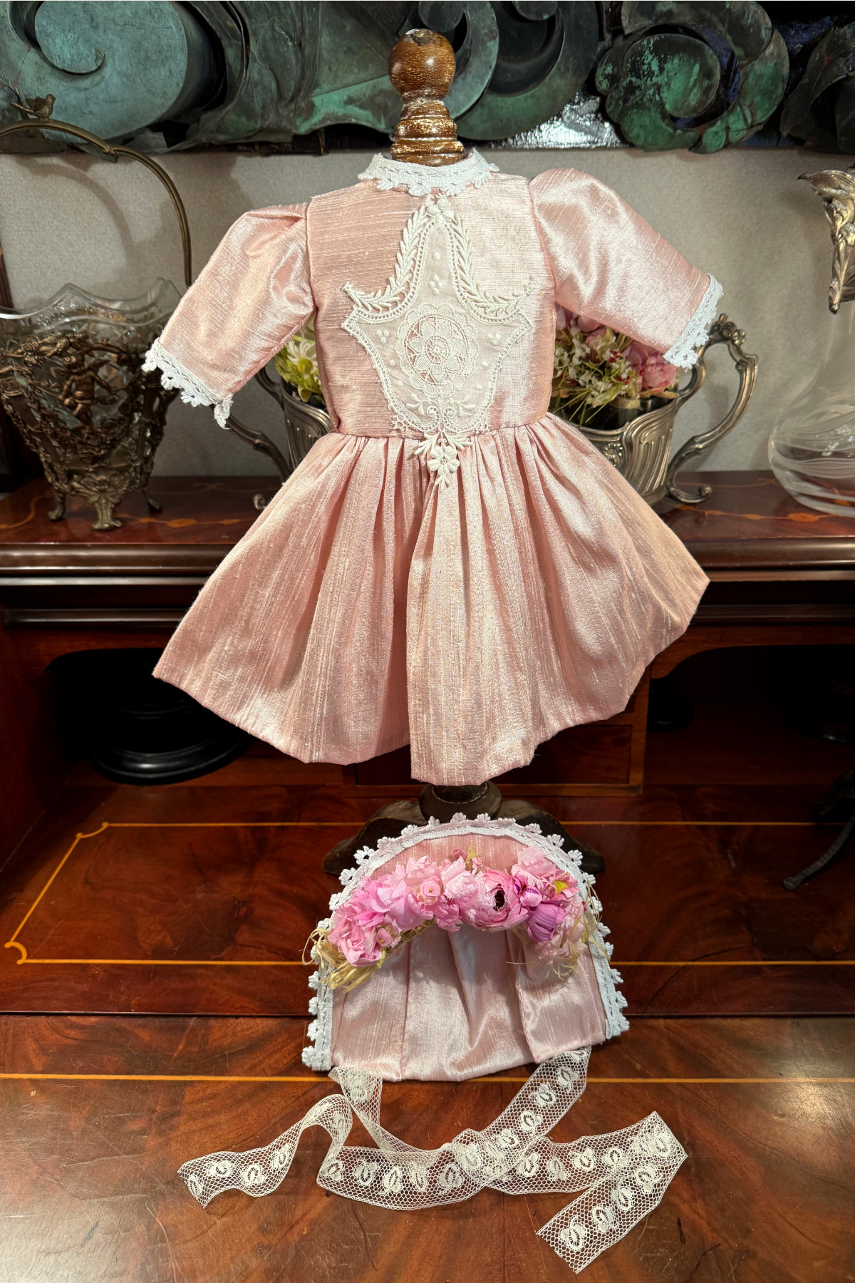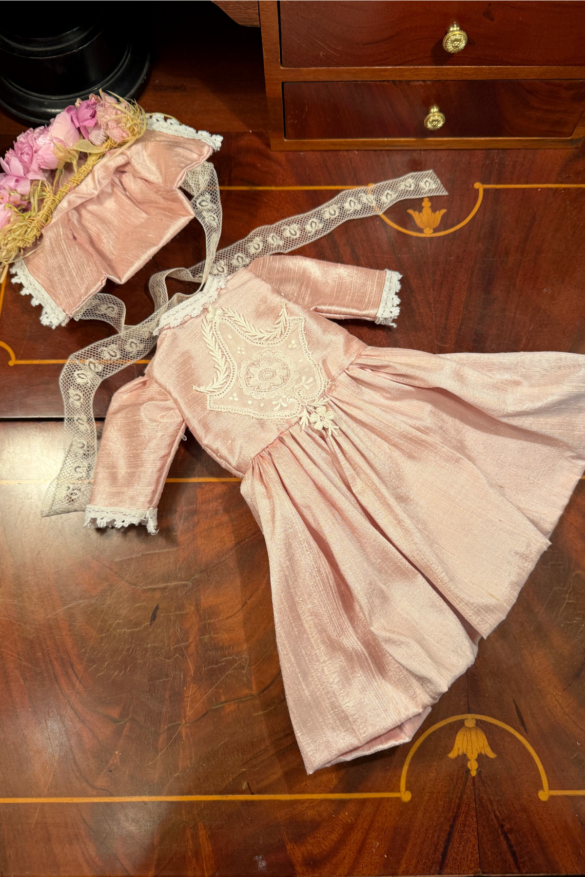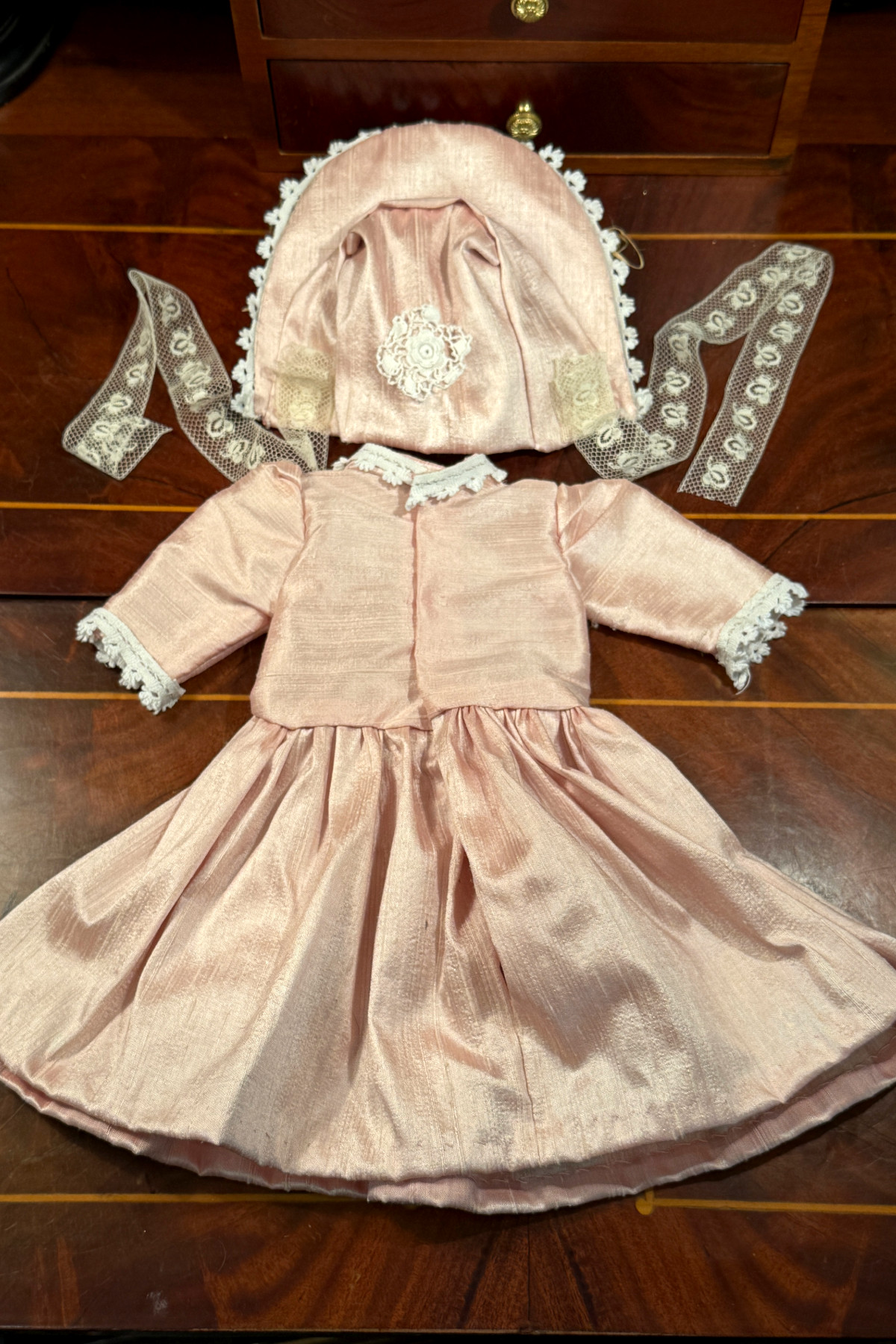 さくら色のシルク生地に古いレースをあしらったドールドレスとボンネットのセット。