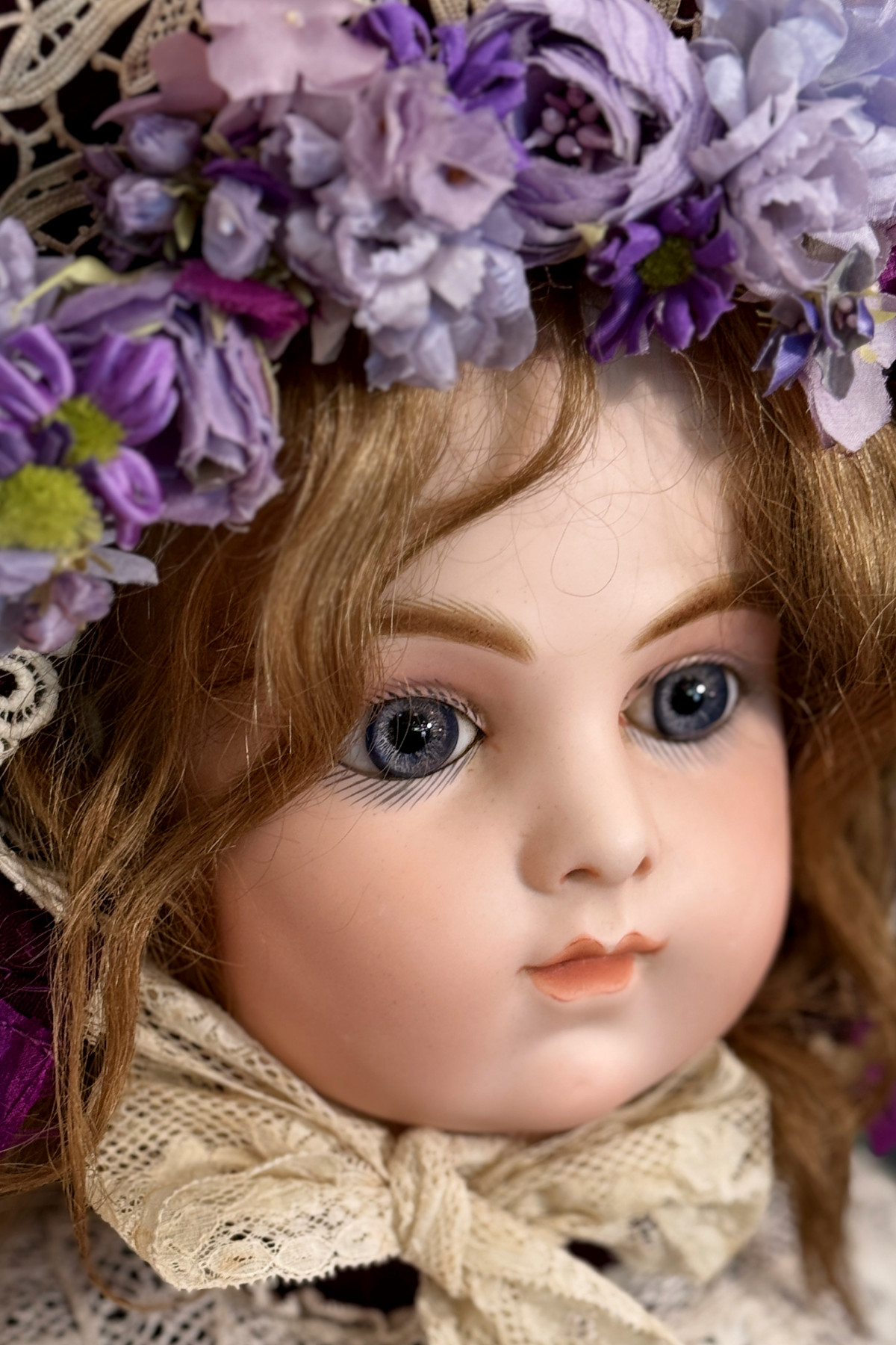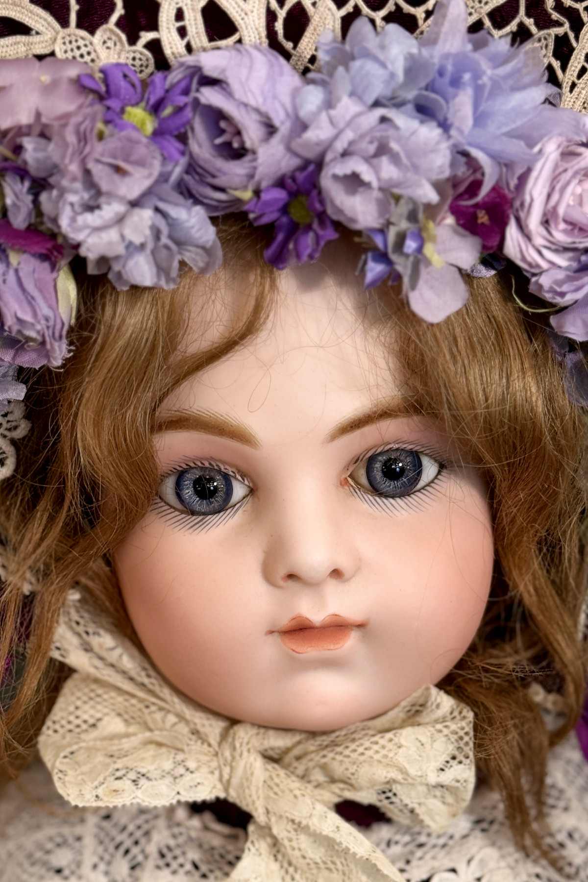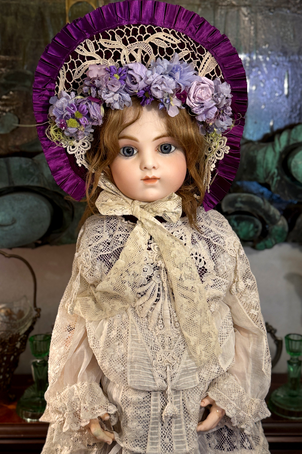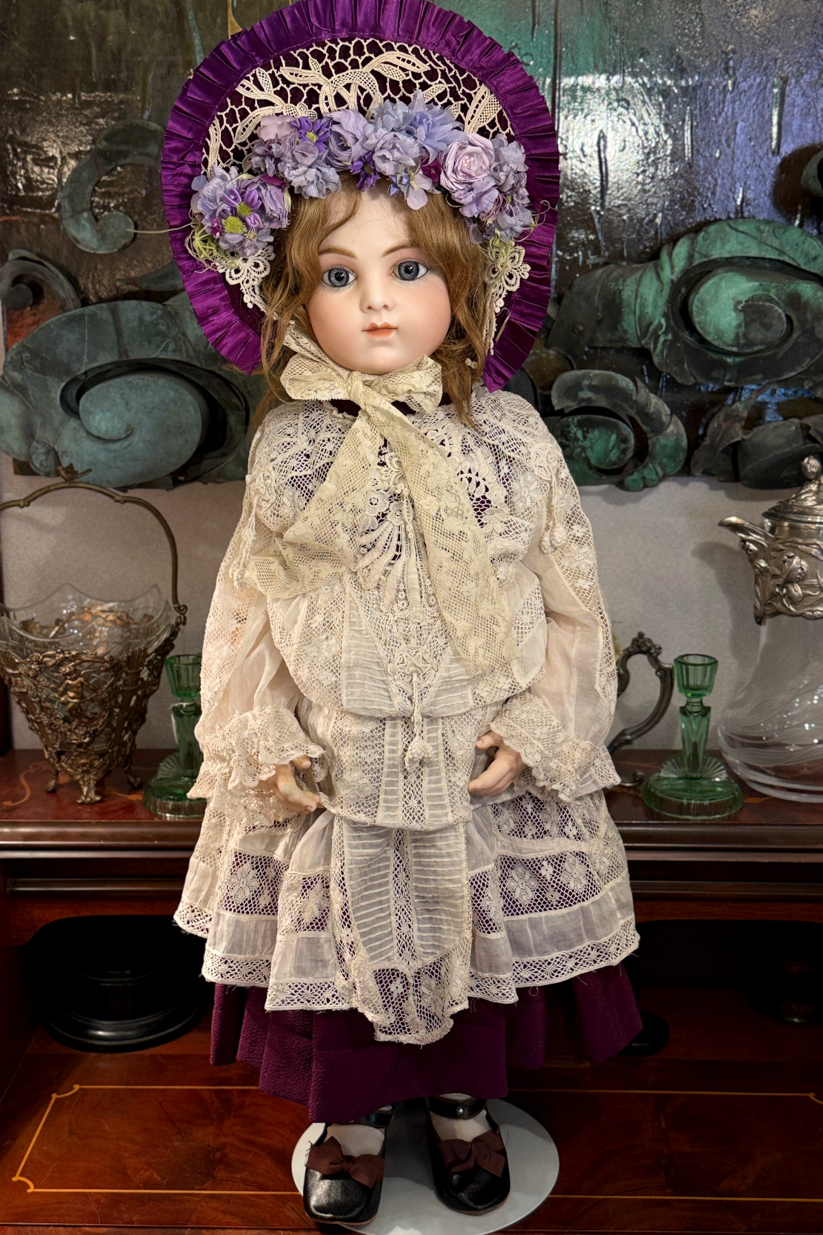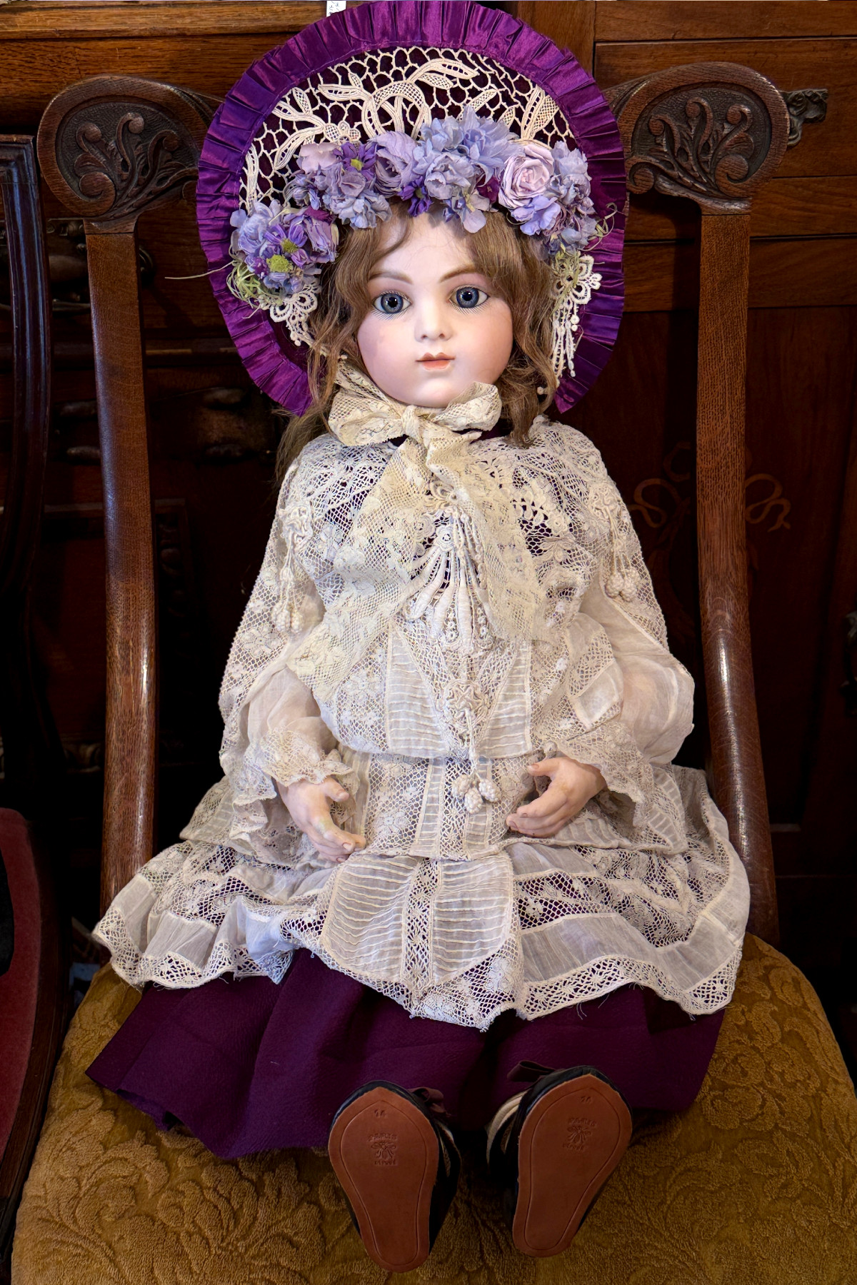 ドレスとボンネットは紫色のシルク地に古いレースをあしらって作った物を